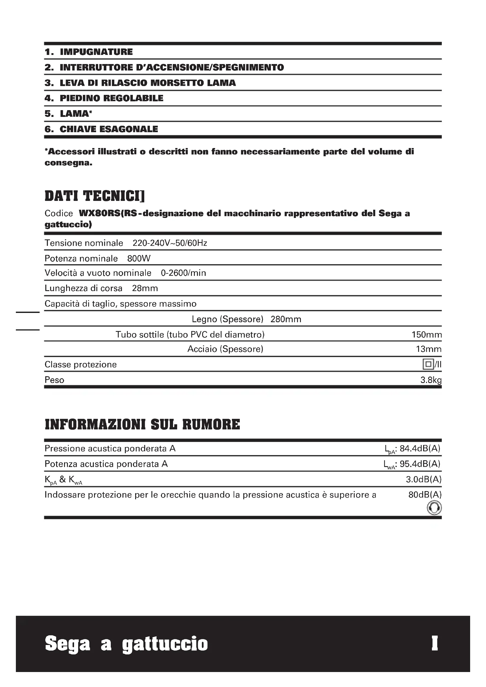 Tensione nominale 220-240V~50/60Hz Potenza nominale 800W Velocità a vuoto nominale 0-2600/min Lunghezza di corsa 28mm Capacità di taglio, spessore massimo Legno (Spessore) 280mm Tubo sottile (tubo PVC del diametro) 150mm Acciaio (Spessore) 13mm Classe protezione /II Peso 3.8kg DATI TECNICI] Codice WX80RS(RS-designazione del macchinario rappresentativo del Sega a gattuccio)
