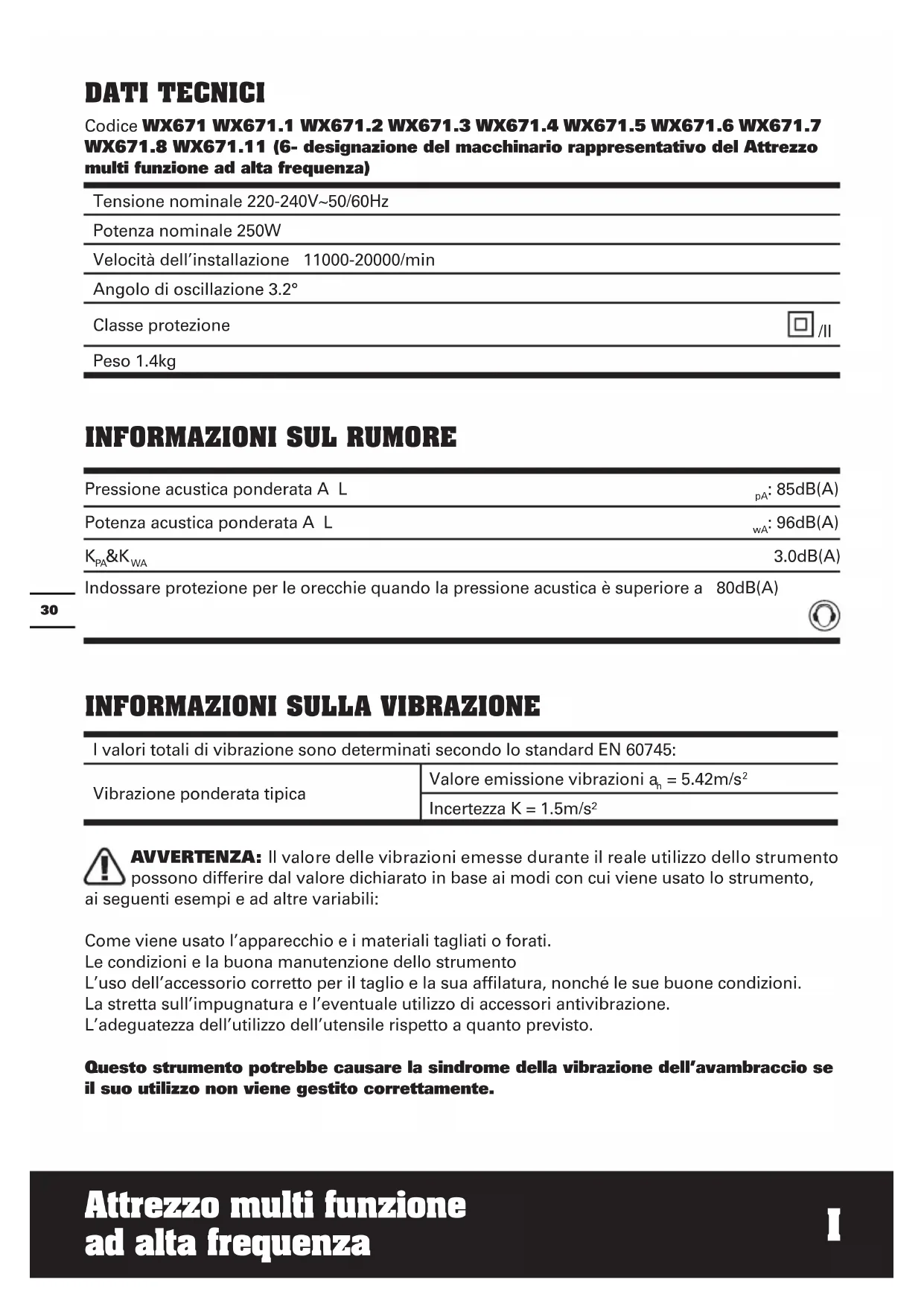 Attrezzo multi funzione ad alta frequenza DATI TECNICI Codice WX671 WX671.1 WX671.2 WX671.3 WX671.4 WX671.5 WX671.6 WX671.7 WX671.8 WX671.11 (6- designazione del macchinario rappresentativo del Attrezzo multi funzione ad alta frequenza) INFORMAZIONI SuL RuMORE Pressione acustica ponderata A L