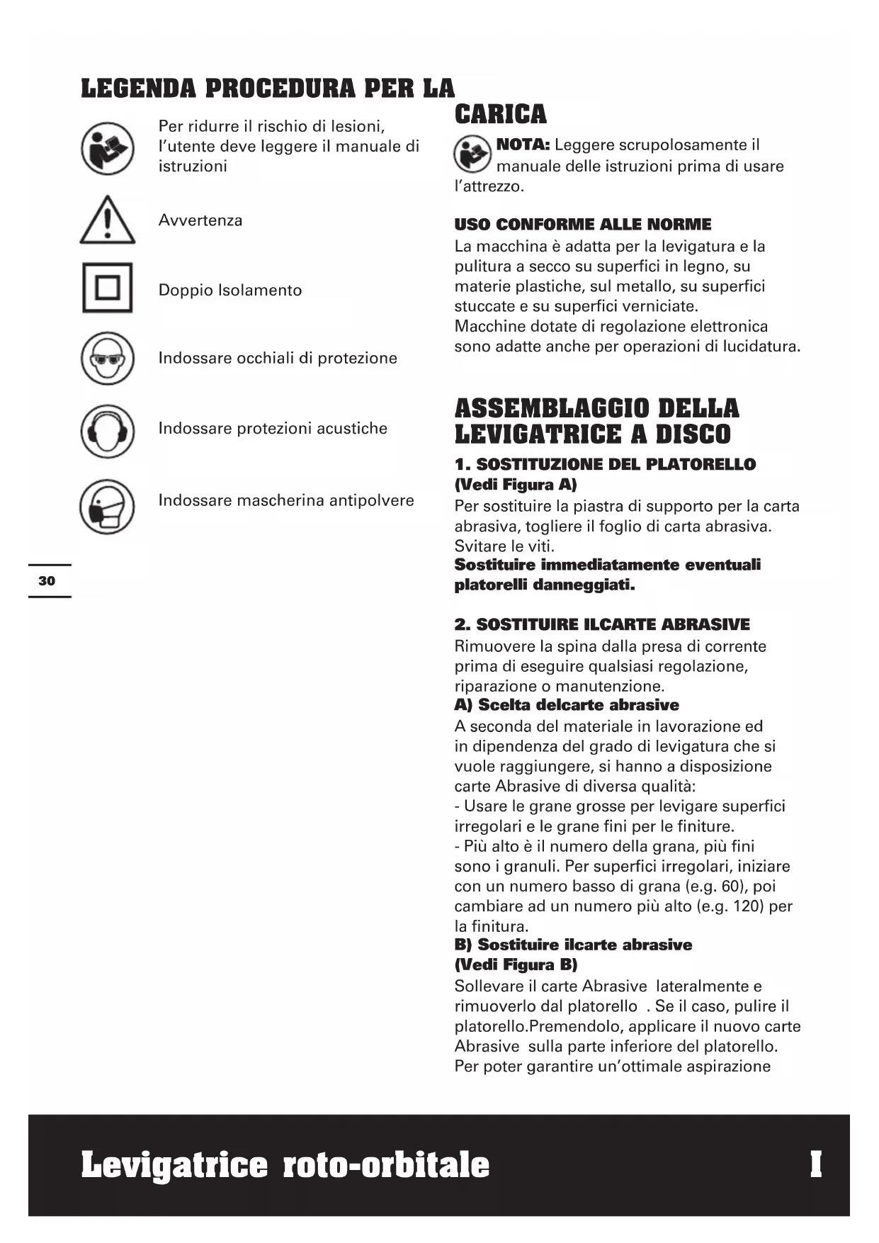 La macchina è adatta per la levigatura e la pulitura a secco su superfici in legno, su materie plastiche, sul metallo, su superfici stuccate e su superfici verniciate. Macchine dotate di regolazione elettronica sono adatte anche per operazioni di lucidatura. ASSEMBLAGGIO DELLA