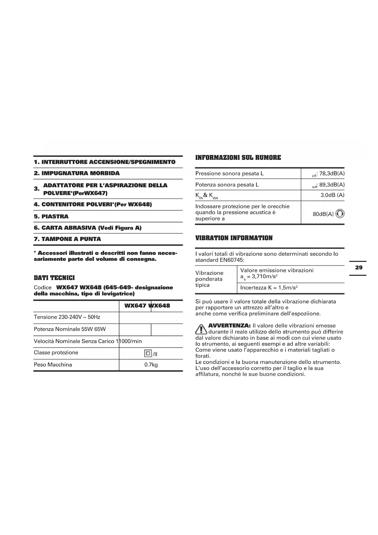 - Accessori illustrati o descritti non fanno neces- sariamente parte del volume di consegna. DATI TECNICI Codice WX647 WX648 (645-649- designazione della macchina, tipo di levigatrice) WX647 WX648 Tensione 230-240V ~ 50Hz Potenza Nominale 55W 65W Velocità Nominale Senza Carico 11000/min Classe protezione /ll Peso Macchina 0.7kg