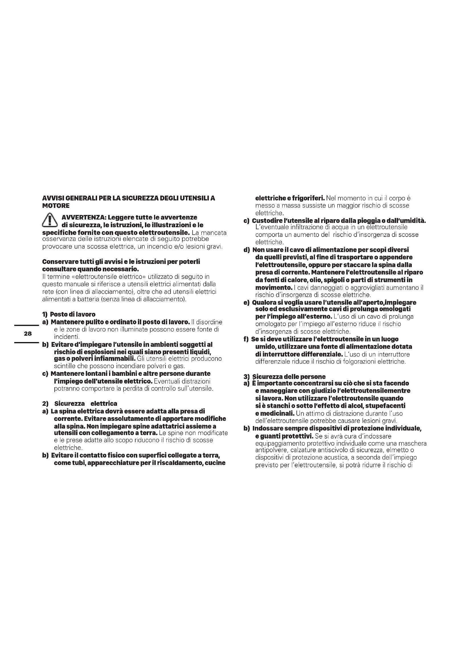 d) Custodire gli elettroutensili non utilizzati fuori della portata dei bambini. Non fare usare l'apparecchio a personone non abituate a farlo o che non abbiano fatto le presenti istruzioni. Gli elettroutensili sono pericolosi se utilizzati da persone inesperte.