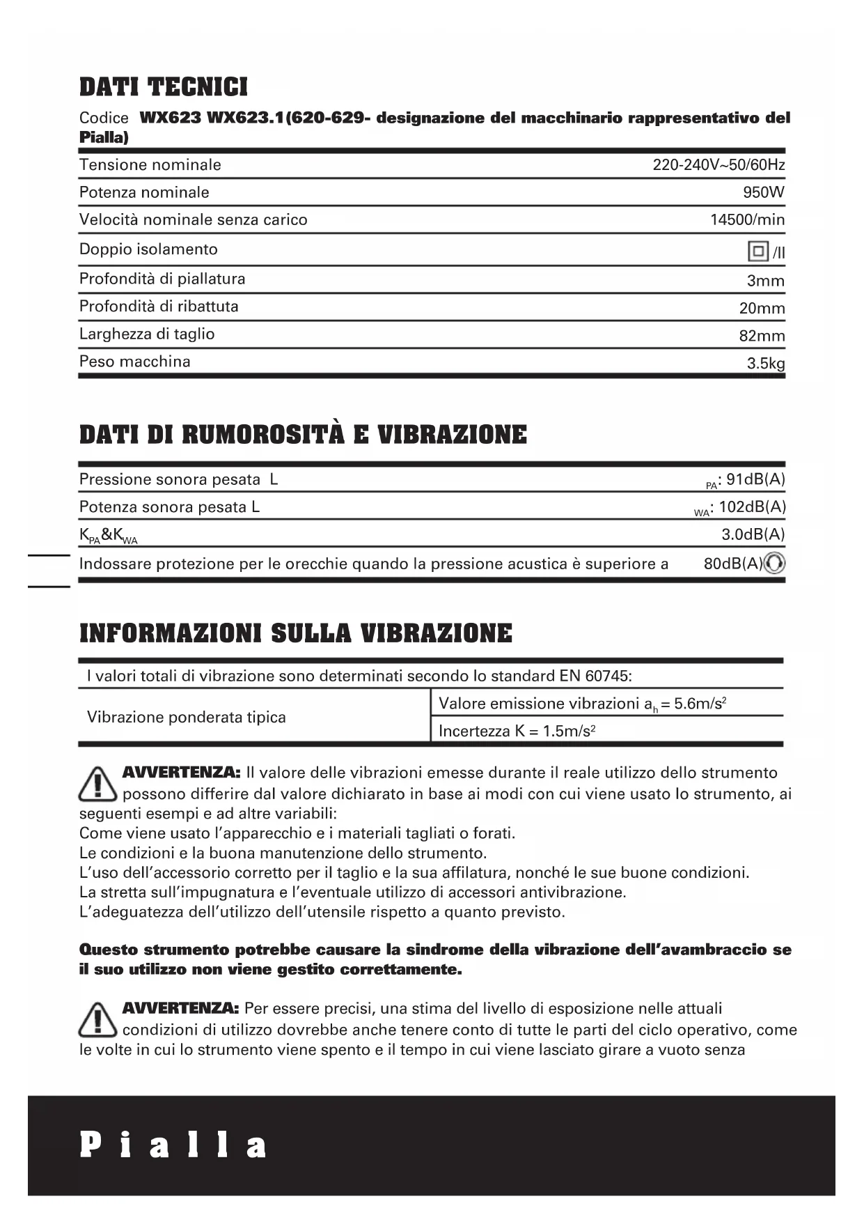 Scarica le istruzioni per il tuo Pialla in formato PDF gratuitamente! Trova il tuo manuale WX623.1 - WORX e riprendi in mano il tuo dispositivo elettronico. In questa pagina sono pubblicati tutti i documenti necessari per l'utilizzo del tuo dispositivo. WX623.1 del marchio WORX.