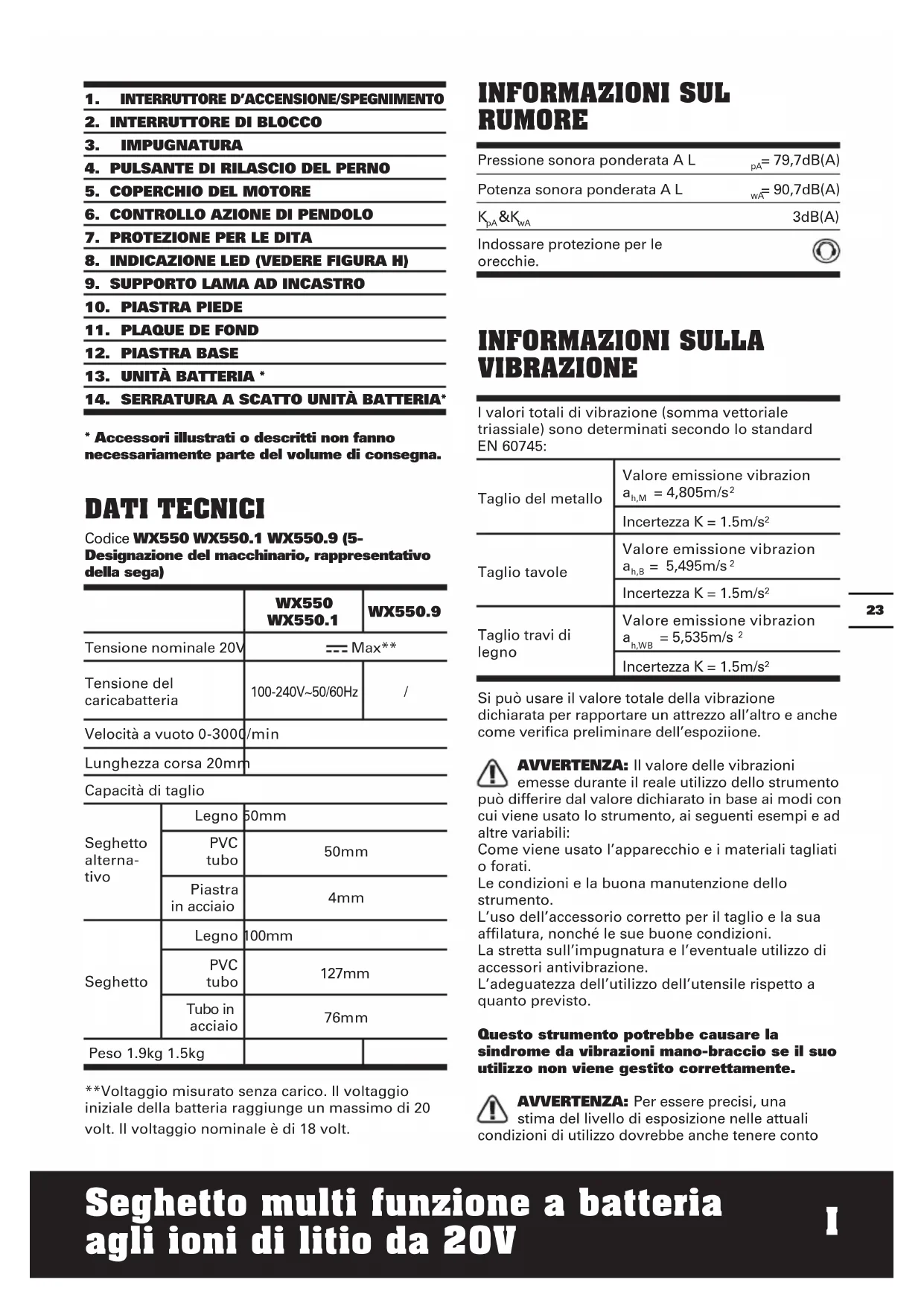 C o inferiori. Pianificare il programma di lavoro in modo da suddividere i lavori che implicano le maggiori vibrazioni nell’arco di più giorni. ACCESSORI WX550 WX550.1 WX550.9 1 ora Caricabatteria (WA3860) 1 1 / 2Ah Batteria (WA3551.1) 1 2 / Lama del seghetto alternativo per legno