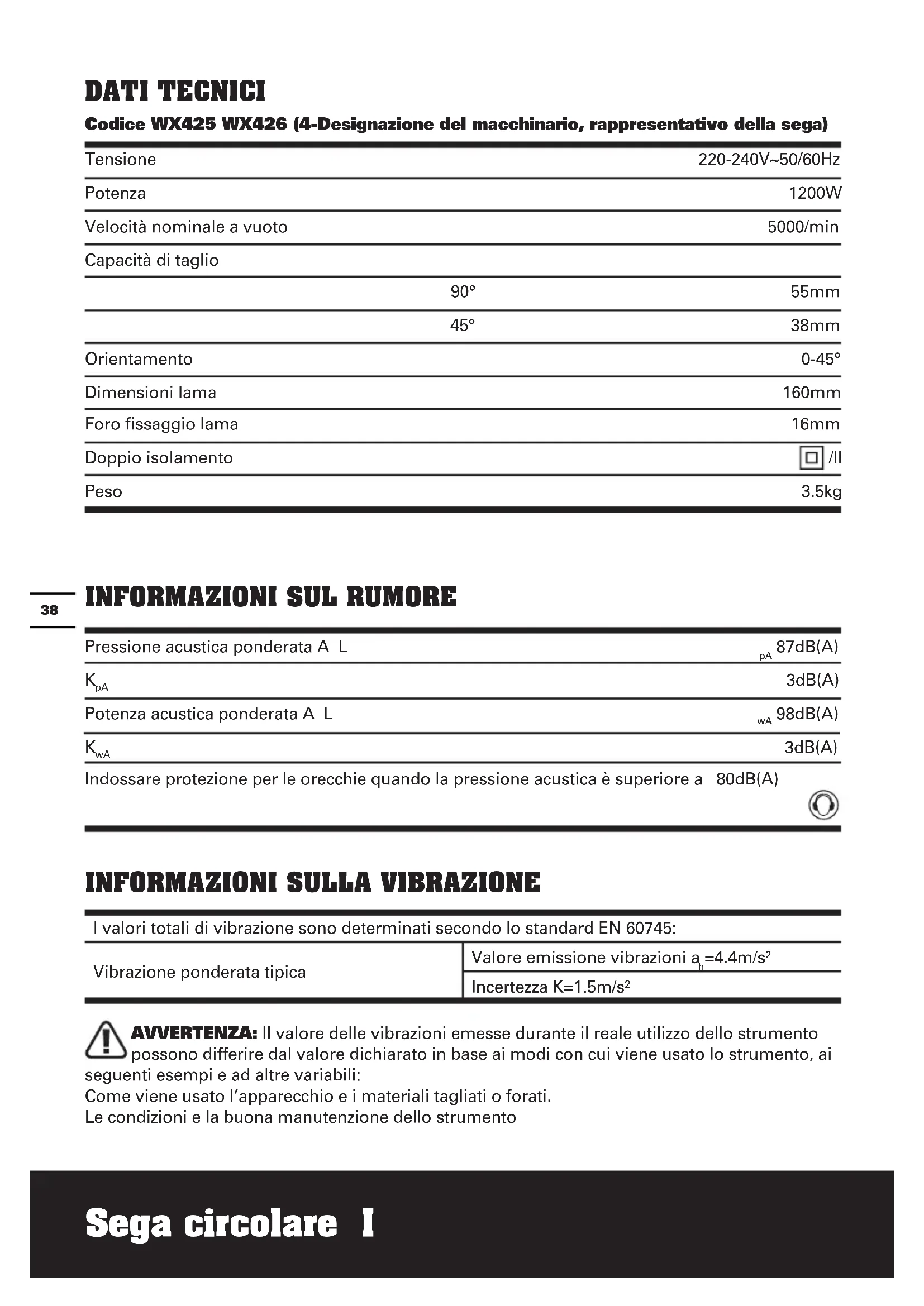 DATI TECNICI Codice WX425 WX426 (4-Designazione del macchinario, rappresentativo della sega)