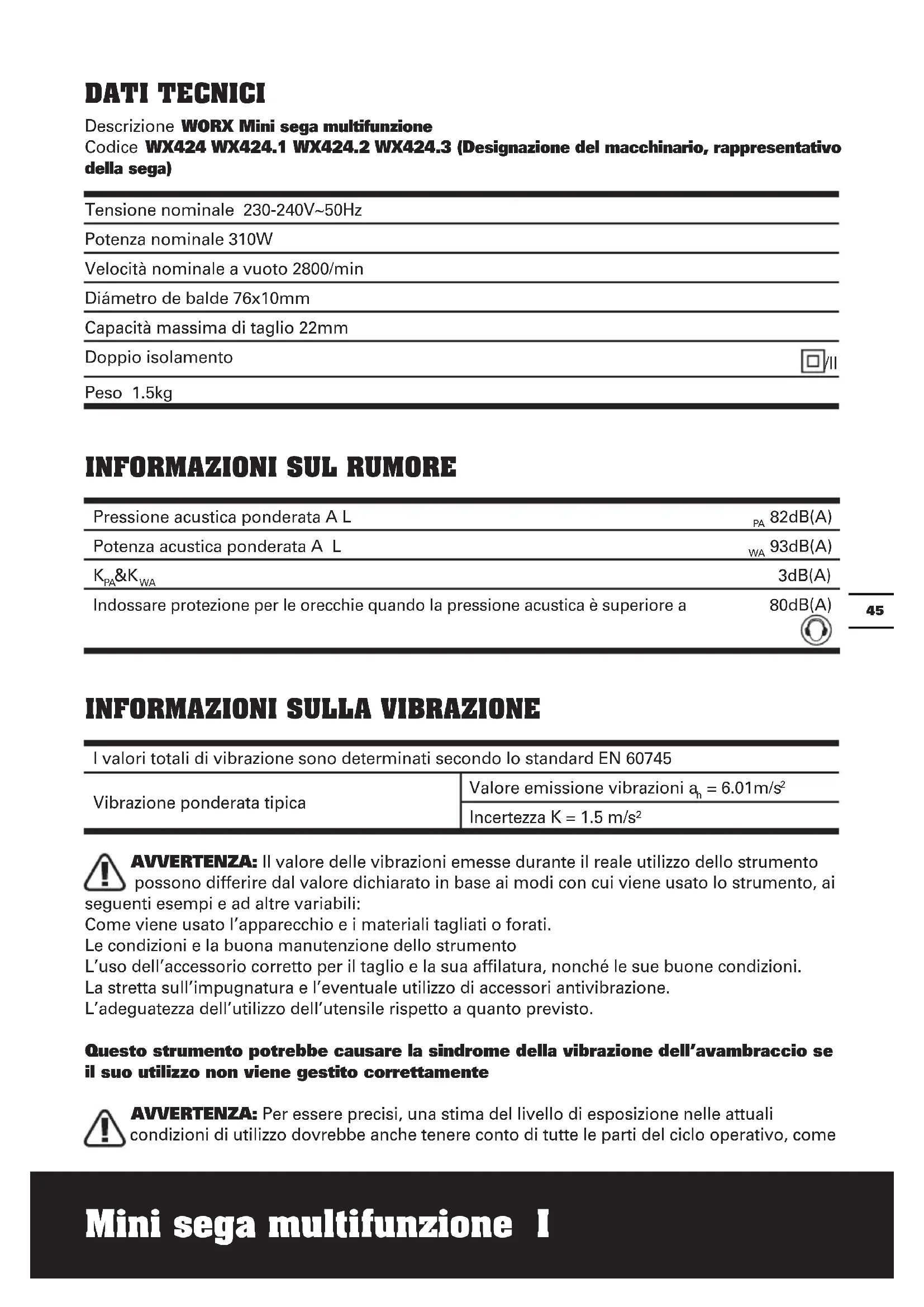 DATI TECNICI Descrizione WORX Mini sega multifunzione Codice WX424 WX424.1 WX424.2 WX424.3 (Designazione del macchinario, rappresentativo della sega) Tensione nominale 230-240V~50Hz Potenza nominale 310W Velocità nominale a vuoto 2800/min Diámetro de balde 76x10mm Capacità massima di taglio 22mm Doppio isolamento /II Peso 1.5kg
