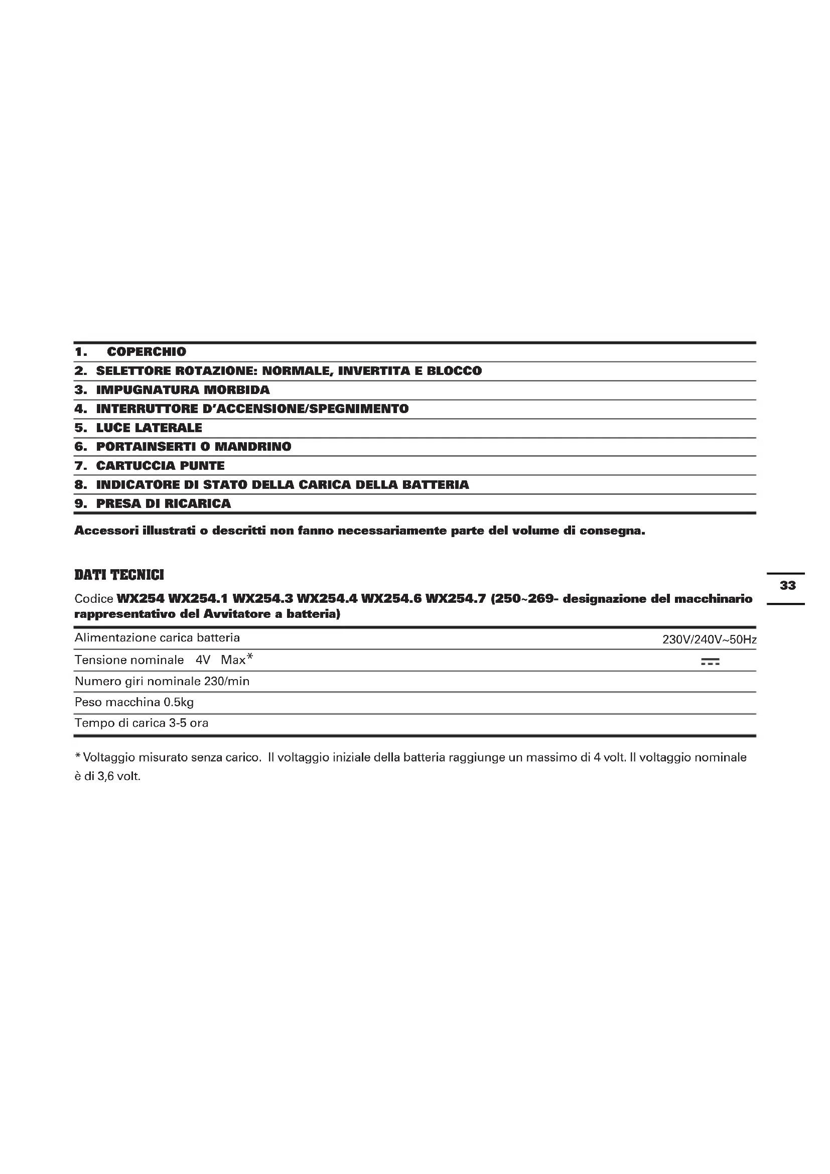 C o inferiori. Pianificare il programma di lavoro in modo da suddividere i lavori che implicano le maggiori vibrazioni nell’arco di più giorni. ACCESSORI WX254 WX254.1 WX254.3 WX254.4 WX254.6 WX254.7 25mm Inserto 5 11 6 5 5 11 Punta 25mm per foro pilota 1 1 / 1 1 1 Caricabatteria da 3-5 ora 1 1 1 1 1 1 Cartuccia punte 1 2 1 1 1 2 Custodia / 1 / / / 1 Base 1 1 / / / /36