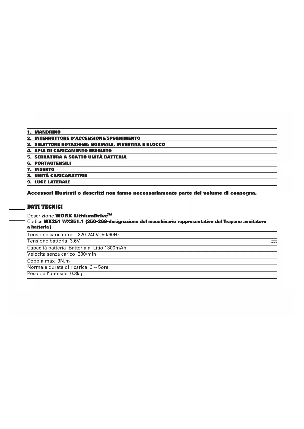 Accessori illustrati o descritti non fanno necessariamente parte del volume di consegna. daTi Tecnici Descrizione WORX LithiumDrive