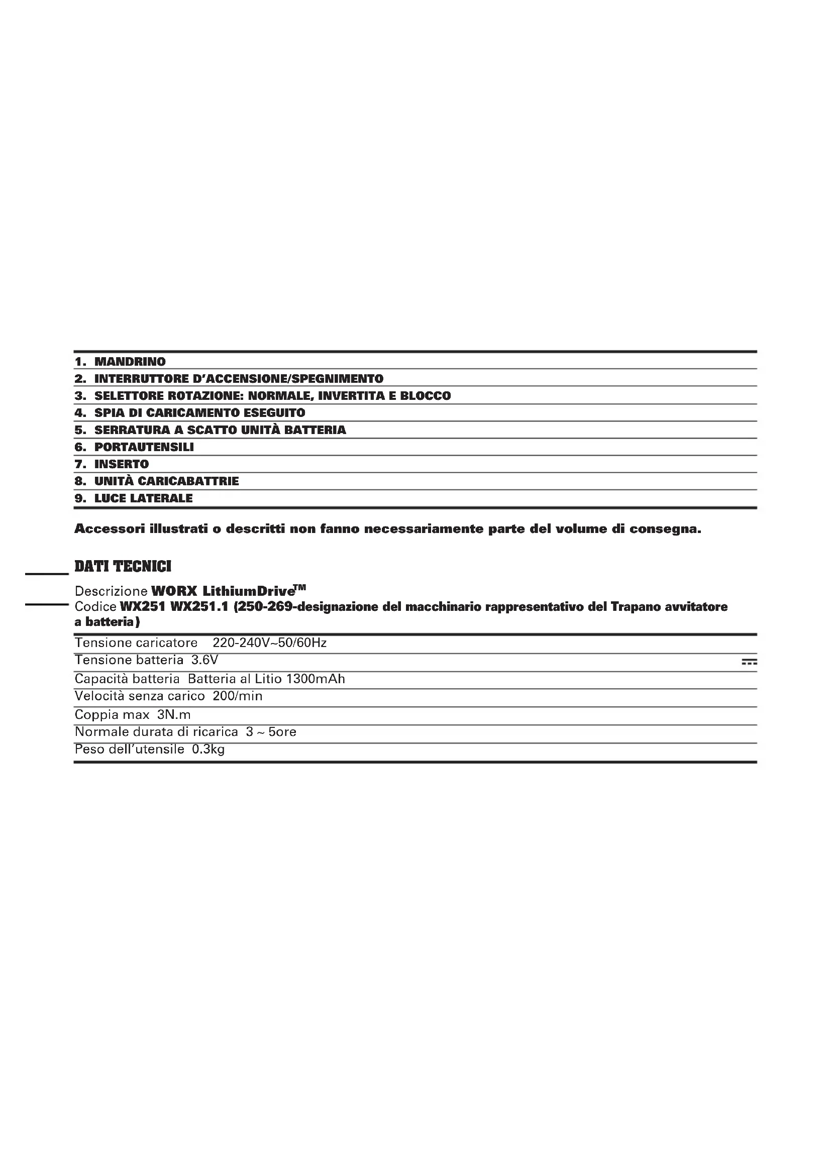 Accessori illustrati o descritti non fanno necessariamente parte del volume di consegna. daTi Tecnici Descrizione WORX LithiumDrive