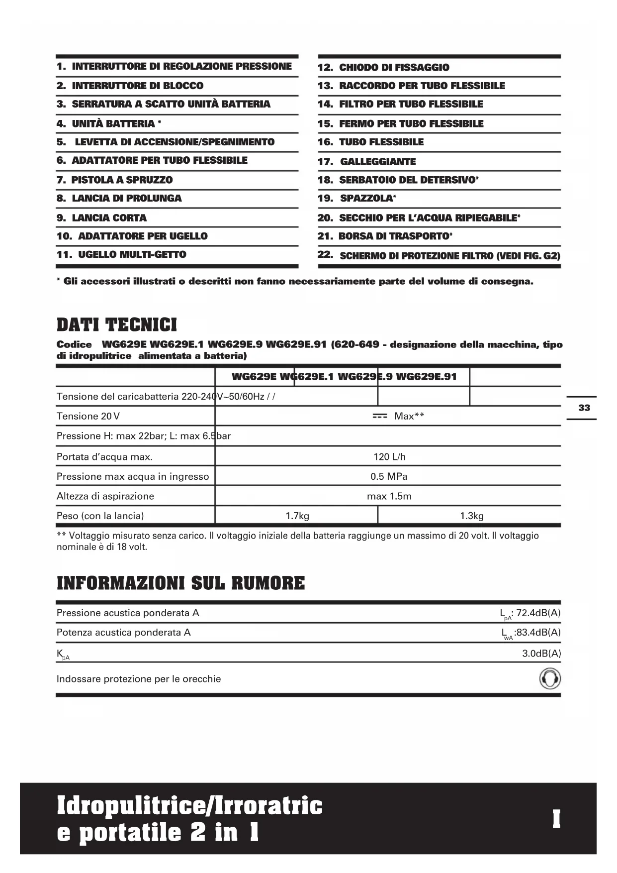 Codice WG629E WG629E.1 WG629E.9 WG629E.91 (620-649 - designazione della macchina, tipo di idropulitrice alimentata a batteria)