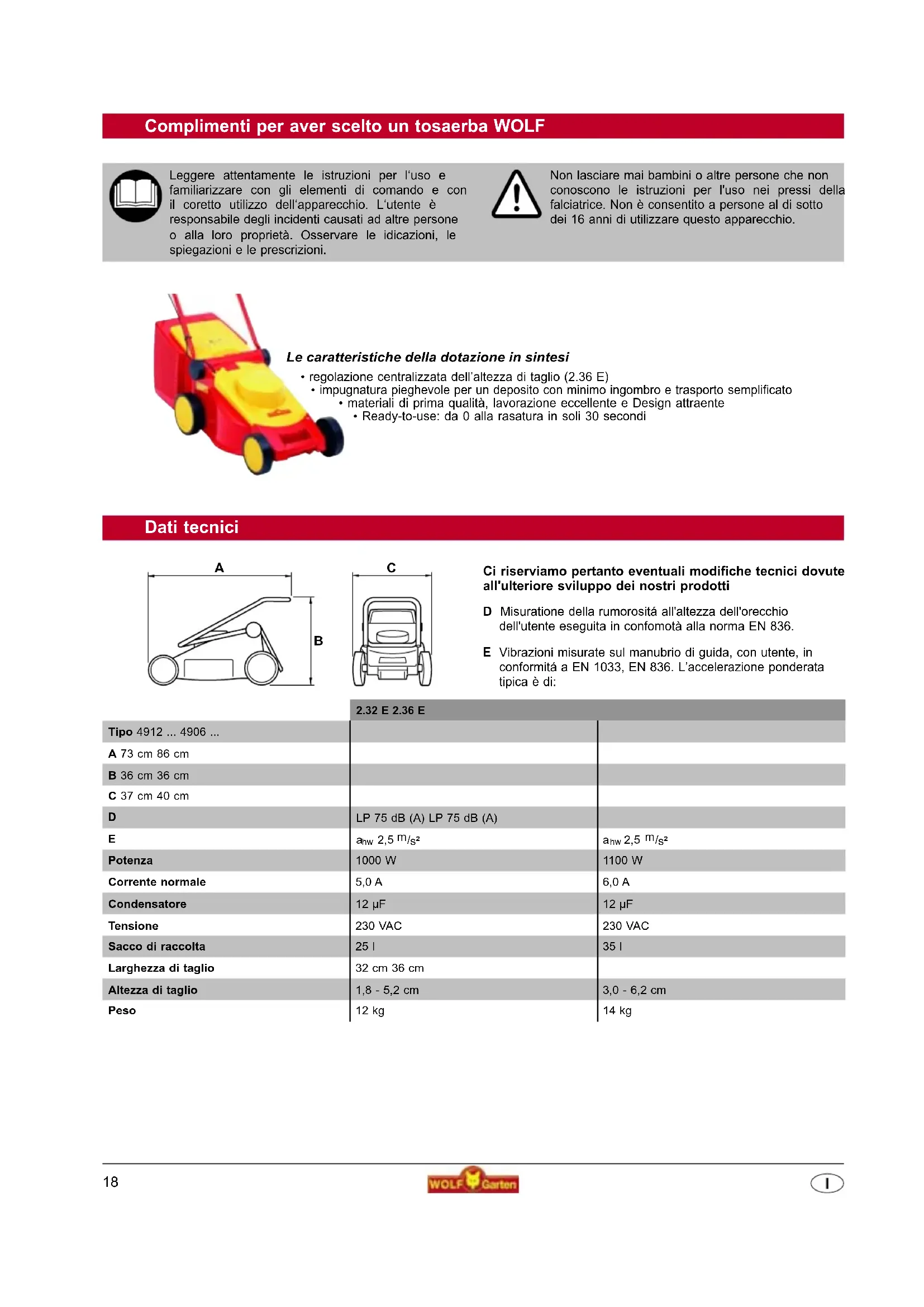 En cas de doute, consulter toujours l‘atelier de service aprés-vente WOLF. Attention, arrêter la tondeuse avant tout contrôle, tout nettoyage et tous travaux sur la lame et retirer la che secteur. 17Dati tecnici D Misuratione della rumorositá all'altezza dell'orecchio dell'utente eseguita in confomotà alla norma EN 836. Vibrazioni misurate sul manubrio di guida, con utente, in conformitá a EN 1033, EN 836. L’accelerazione ponderata tipica è di: Ci riserviamo pertanto eventuali modifiche tecnici dovute all'ulteriore sviluppo dei nostri prodotti Complimenti per aver scelto un tosaerba WOLF Leggere attentamente le istruzioni per l‘uso e familiarizzare con gli elementi di comando e con il coretto utilizzo dell‘apparecchio. L‘utente è responsabile degli incidenti causati ad altre persone o alla loro proprietà. Osservare le idicazioni, le spiegazioni e le prescrizioni. Non lasciare mai bambini o altre persone che non conoscono le istruzioni per l'uso nei pressi della falciatrice. Non è consentito a persone al di sotto dei 16 anni di utilizzare questo apparecchio.
