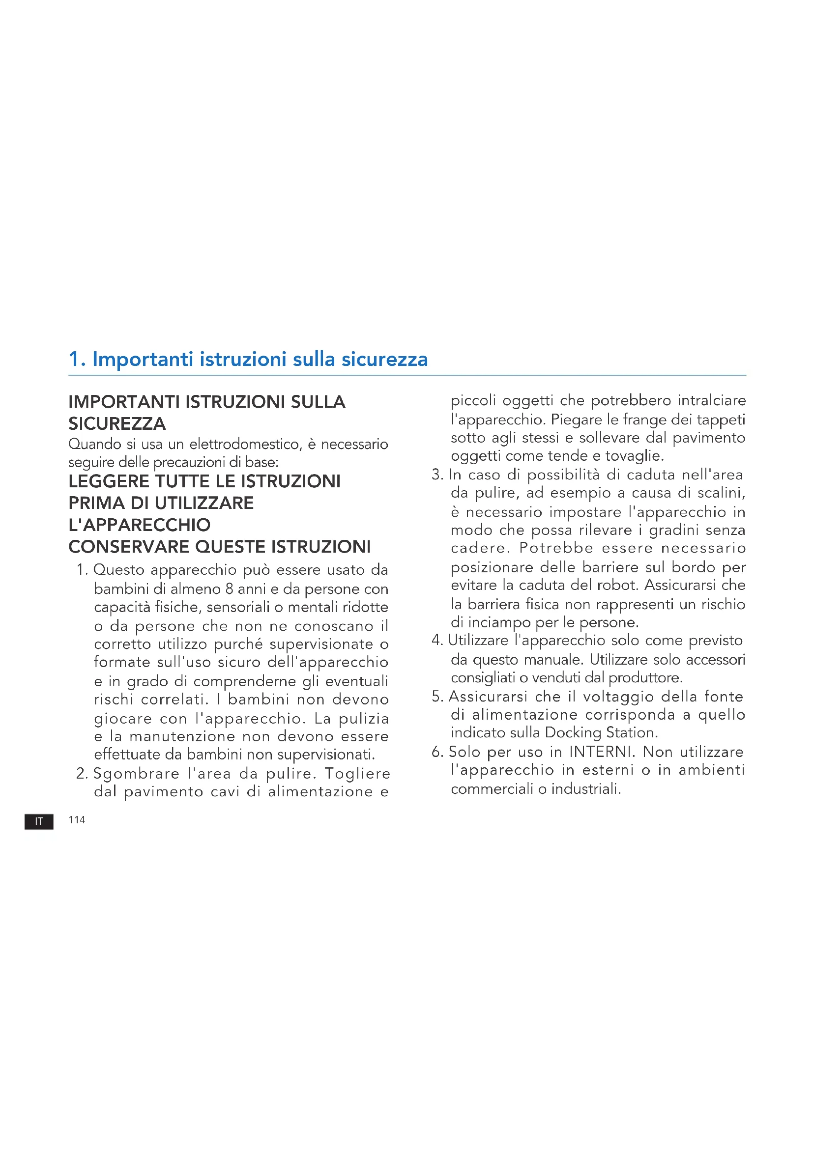 secondo le indicazioni di questo Manuale d'uso. ECOVACS ROBOTICS non potrà essere ritenuta responsabile per eventuali danni o infortuni causati da un utilizzo inappropriato.