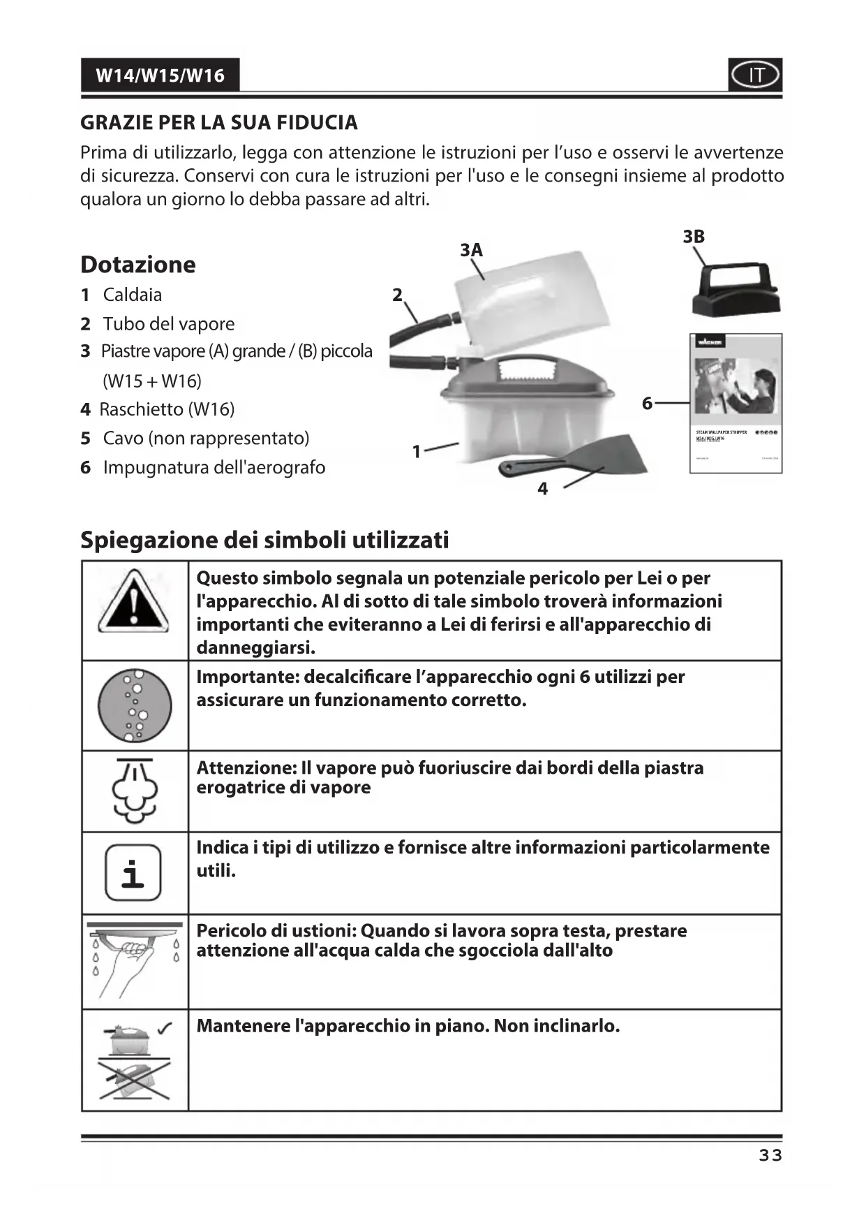 Lavorando con il vapore caldo (min. 100^ ), vi è il rischio di gravi scottature. Quando la valvola di sicurezza (5 A) viene attivata a causa di sovrappressione dovuta al funzionamento non corretto dell'unità, si può verificare l'émissione di vapore caldo e acqua bollente. Cambiare posizione con cautela durante l'uso. Il vaporizzatore, il tubo flessibile e la piastra a vapore possono essere molto caldi. Indossare sempre indumenti/guanti di protezione adatti. Utilizzato l'unità solo con acqua pura perché allcun prodotto o additivo. Non accendere l'unità se vuota.