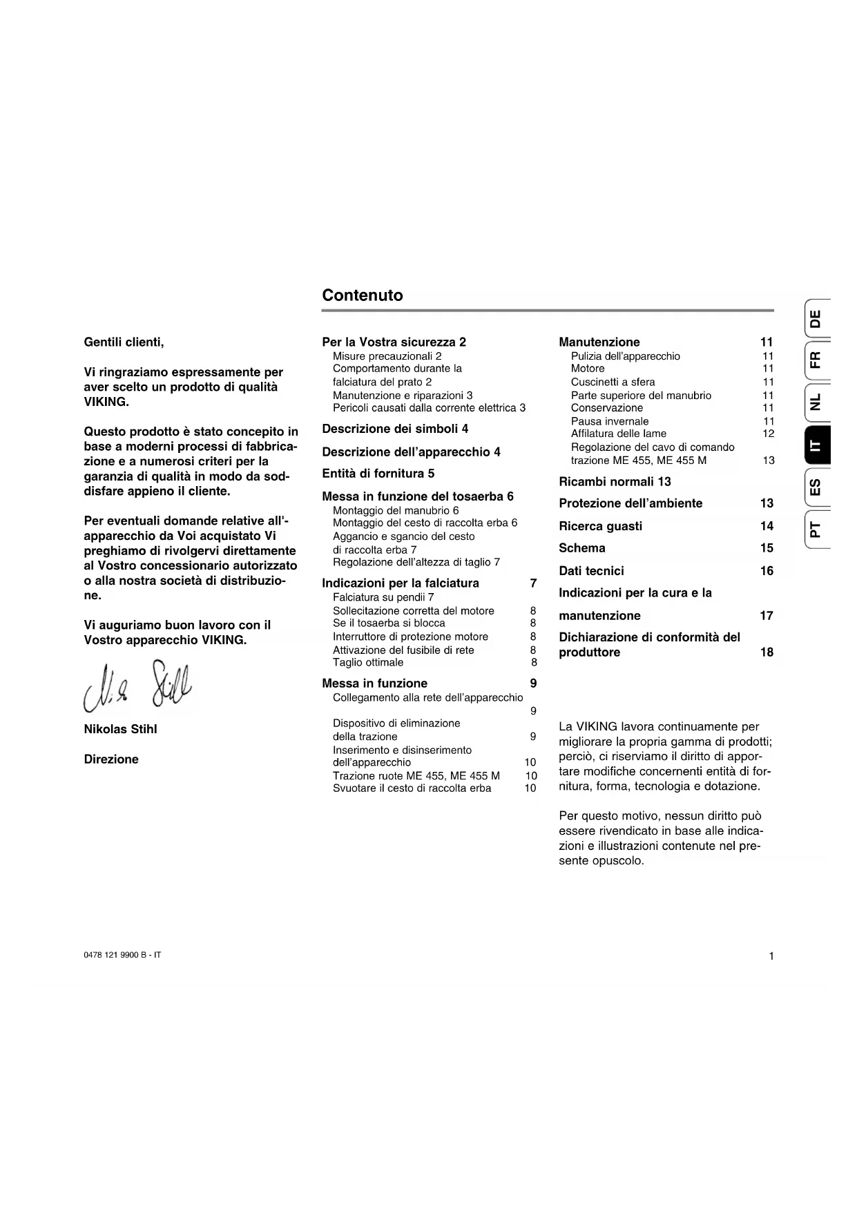 Tutti i lavori elencati nel paragrafo "Manutenzione" vanno eseguiti periodi- camente. Nel caso in cui l’utente non fosse in grado di effettuare questi lavori di manutenzione, occorre rivolgersi ad un rivenditore specializzato autorizzato. Se non si effettuano tali lavori, potreb- bero insorgere danni di cui l’utente è il diretto responsabile. Alcuni tra questi sono anche: - danni al motore di azionamento a seguito di scarsa pulizia del convo- gliamento di aria raffreddata (fessu- re di aspirazione) - danni derivanti da corrosione o indi- retti a causa di una conservazione inappropriata - danni indiretti derivanti dall’uso di ricambi non originali VIKING - danni derivanti da lavori di riparazio- ne e manutenzione non eseguiti nelle officine da rivenditori specializ- zati autorizzati18 0478 121 9900 B - IT La sottoscritta, VIKING GmbH Hans Peter Stihl-Straße 5 A-6336 Langkampfen / Kufstein dichiara che la macchina Tosaerba, a spinta con motore elettrico Marchio di fabbrica: VIKING Modello: ME 400 ME 450 ME 400 M ME 450 M ME 455 ME 455 M N. identificativo di serie: 6117 6101 è conforme alle seguenti direttive CE: 98/37/CE, 73/23/CEE, 89/336/CEE, 2000/14/CE Il prodotto è stato sviluppato e fabbri- cato conformemente alle seguenti norme: EN 836, DIN VDE 0700-1, DIN VDE 0700-206, EN 55014-1, EN 55014-2, EN 55104, EN 61000-3-2, EN 61000-3-3 Procedimento di valutazione conformità applicato: Allegato VI Nome e indirizzo degli uffici interessati menzionati: Societe Nationale de Certification et d’Homologation S.a.r.l. 11, Route de Sandweiler 5230 Sandweiler Luxembourg Documentazione tecnica conservata presso: VIKING GmbH Licenza prodotto Livello di potenza acustica misurata: 87 dB(A) ME 400/ M 91 dB(A) ME 450/ M, ME 455/ M Livello di potenza acustica garantito: 90 dB(A) ME 400/ M 94 dB(A) ME 450/ M, ME 455/ M Langkampfen, 05.11.2002 VIKING GmbH Lechner Direttore Esecutivo / Direttore Marketing Dichiarazione di conformità del produttore0478 121 9900 B - ES ME 400 M = ME 400 ME 450 M = ME 450 + ME 455 M = ME 455 Cuchilla tándem, Dispositivo Mulching1 0478 121 9900 B - ES