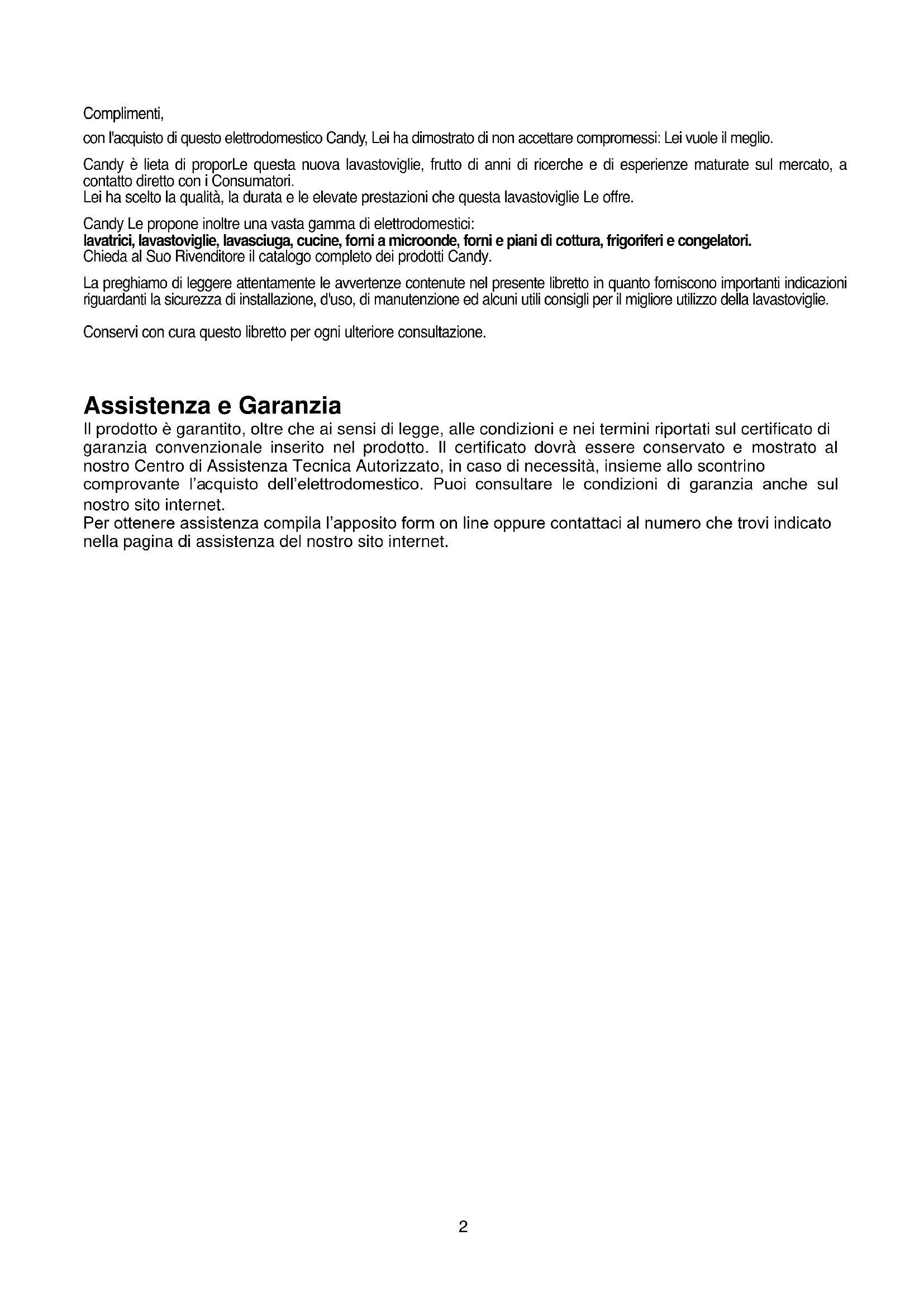 AFWASMACHINE2 Complimenti, con l'acquisto di questo elettrodomestico Candy, Lei ha dimostrato di non accettare compromessi: Lei vuole il meglio. Candy è lieta di proporLe questa nuova lavastoviglie, frutto di anni di ricerche e di esperienze maturate sul mercato, a contatto diretto con i Consumatori. Lei ha scelto la qualità, la durata e le elevate prestazioni che questa lavastoviglie Le offre. Candy Le propone inoltre una vasta gamma di elettrodomestici: lavatrici, lavastoviglie, lavasciuga, cucine, forni a microonde, forni e piani di cottura, frigoriferi e congelatori. Chieda al Suo Rivenditore il catalogo completo dei prodotti Candy. La preghiamo di leggere attentamente le avvertenze contenute nel presente libretto in quanto forniscono importanti indicazioni riguardanti la sicurezza di installazione, d'uso, di manutenzione ed alcuni utili consigli per il migliore utilizzo della lavastoviglie. Conservi con cura questo libretto per ogni ulteriore consultazione. Assistenza e Garanzia Il prodotto è garantito, oltre che ai sensi di legge, alle condizioni e nei termini riportati sul certificato di garanzia convenzionale inserito nel prodotto. Il certificato dovrà essere conservato e mostrato al nostro Centro di Assistenza Tecnica Autorizzato, in caso di necessità, insieme allo scontrino comprovante l’acquisto dell’elettrodomestico. Puoi consultare le condizioni di garanzia anche sul nostro sito internet. Per ottenere assistenza compila l’apposito form on line oppure contattaci al numero che trovi indicato nella pagina di assistenza del nostro sito internet.3 A Pulsante "ON/OFF" B Pulsante "SELEZIONE PROGRAMMA"