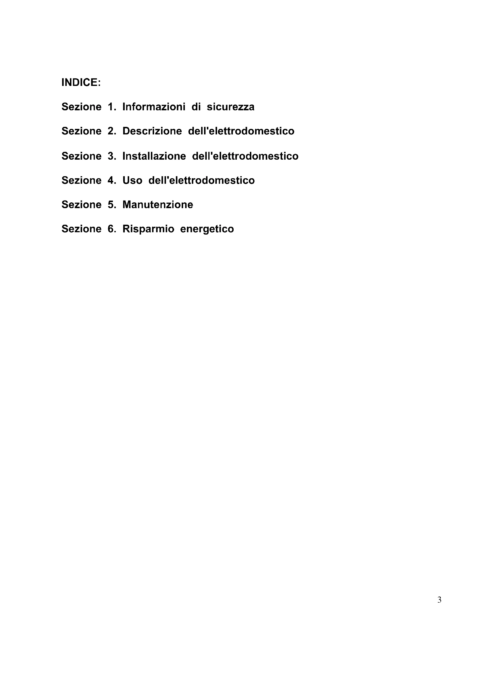 INDICE: Sezione 1. Informazioni di sicurezza Sezione 2. Descrizione dell'elettrodomestico Sezione 3. Installazione dell'elettrodomestico Sezione 4. Uso dell'elettrodomestico Sezione 5. Manutenzione Sezione 6. Risparmio energetico4 Grazie per aver acquistato questo prodotto. Prima di utilizzare il frigorifero, leggere attentamente questo manuale di istruzioni per ottimizzare il rendimento dell'elettrodomestico. Conservare tutta la documentazione per future consultazioni o per altri proprietari. Questo prodotto è destinato esclusivamente all'uso domestico o applicazioni simili, come: - zone cucina per il personale di negozi, uffici e altri ambienti lavorativi, - aziende agricole, clienti di hotel e motel e altri ambienti residenziali, - ad es. Bed and Breakfast (B&B), - servizi di catering e altri usi diversi dalla vendita al dettaglio. Questo elettrodomestico deve essere utilizzato esclusivamente per la conservazione di alimenti. Altri utilizzi sono pericolosi e il produttore in questi casi non sarà responsabile. Si raccomanda di consultare le condizioni della garanzia. Per un funzionamento senza problemi e per ottimizzare il rendimento dell'elettrodomestico, leggere attentamente queste istruzioni. Il mancato rispetto delle istruzioni fornite potrebbe annullare il diritto all'assistenza gratuita durante il periodo di garanzia.5 Sezione 1. INFORMAZIONI DI SICUREZZA Questa guida contiene numerose informazioni importanti per la sicurezza. Conservare queste istruzioni in un luogo sicuro per una facile consultazione durante l'uso dell'elettrodomestico. Il frigorifero contiene un gas refrigerante (isobutano, R600a) e un gas isolante (ciclopentano); entrambi i gas sono altamente compatibili con l'ambiente ma sono infiammabili. Attenzione: rischio di incendio Se il circuito di refrigerazione è visibilmente danneggiato: evitare la vicinanza con fiamme libere e fonti di ignizione. Ventilare accuratamente l'ambiente in cui è installato l'elettrodomestico Tempo di funzionamento percentuaonamento 30 min, interruzione 15 min AVVERTENZA! Durate le operazioni di pulizia o trasporto dell'elettrodomestico, fare attenzione a non toccare i cavi metallici del condensatore sul retro dell'elettrodomestico per evitare di ferirsi le dita e le mani o di danneggiare il prodotto.