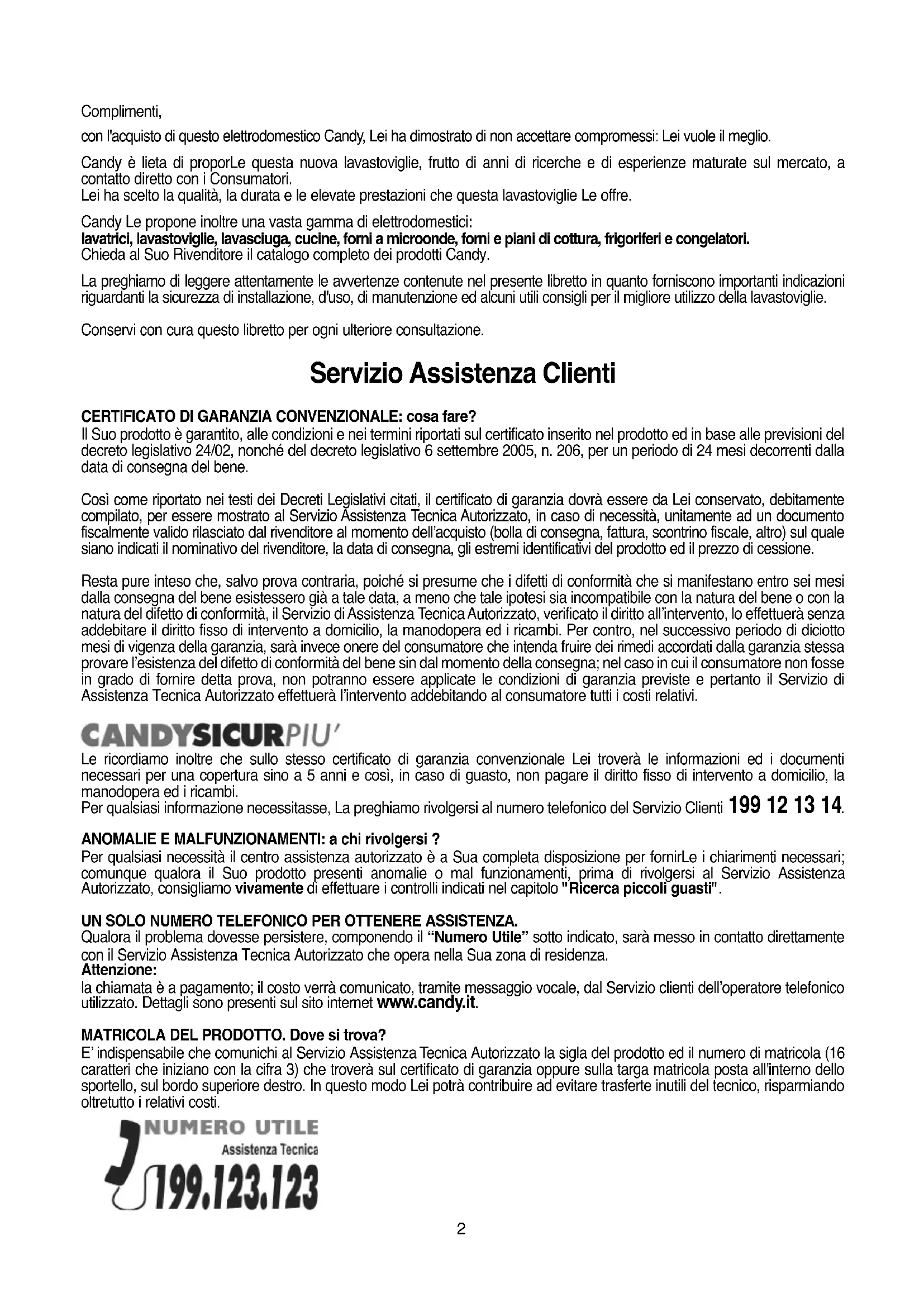 Complimenti, con l'acquisto di questo elettrodomestico Candy, Lei ha dimostrato di non accettare compromessi: Lei vuole il meglio. Candy è lieta di proporLe questa nuova lavastoviglie, frutto di anni di ricerche e di esperienze maturate sul mercato, a contatto diretto con i Consumatori. Lei ha scelto la qualità, la durata e le elevate prestazioni che questa lavastoviglie Le offre. Candy Le propone inoltre una vasta gamma di elettrodomestici: lavatrici, lavastoviglie, lavasciuga, cucine, forni a microonde, forni e piani di cottura, frigoriferi e congelatori. Chieda al Suo Rivenditore il catalogo completo dei prodotti Candy. La preghiamo di leggere attentamente le avvertenze contenute nel presente libretto in quanto forniscono importanti indicazioni riguardanti la sicurezza di installazione, d'uso, di manutenzione ed alcuni utili consigli per il migliore utilizzo della lavastoviglie. Conservi con cura questo libretto per ogni ulteriore consultazione. Servizio Assistenza Clienti CERTIFICATO DI GARANZIA CONVENZIONALE: cosa fare? Il Suo prodotto è garantito, alle condizioni e nei termini riportati sul certificato inserito nel prodotto ed in base alle previsioni del decreto legislativo 24/02, nonché del decreto legislativo 6 settembre 2005, n. 206, per un periodo di 24 mesi decorrenti dalla data di consegna del bene. Così come riportato nei testi dei Decreti Legislativi citati, il certificato di garanzia dovrà essere da Lei conservato, debitamente compilato, per essere mostrato al Servizio Assistenza Tecnica Autorizzato, in caso di necessità, unitamente ad un documento fiscalmente valido rilasciato dal rivenditore al momento dell’acquisto (bolla di consegna, fattura, scontrino fiscale, altro) sul quale siano indicati il nominativo del rivenditore, la data di consegna, gli estremi identificativi del prodotto ed il prezzo di cessione. Resta pure inteso che, salvo prova contraria, poiché si presume che i difetti di conformità che si manifestano entro sei mesi dalla consegna del bene esistessero già a tale data, a meno che tale ipotesi sia incompatibile con la natura del bene o con la natura del difetto di conformità, il Servizio di Assistenza Tecnica Autorizzato, verificato il diritto all’intervento, lo effettuerà senza addebitare il diritto fisso di intervento a domicilio, la manodopera ed i ricambi. Per contro, nel successivo periodo di diciotto mesi di vigenza della garanzia, sarà invece onere del consumatore che intenda fruire dei rimedi accordati dalla garanzia stessa provare l’esistenza del difetto di conformità del bene sin dal momento della consegna; nel caso in cui il consumatore non fosse in grado di fornire detta prova, non potranno essere applicate le condizioni di garanzia previste e pertanto il Servizio di Assistenza Tecnica Autorizzato effettuerà l’intervento addebitando al consumatore tutti i costi relativi. Le ricordiamo inoltre che sullo stesso certificato di garanzia convenzionale Lei troverà le informazioni ed i documenti necessari per una copertura sino a 5 anni e così, in caso di guasto, non pagare il diritto fisso di intervento a domicilio, la manodopera ed i ricambi. Per qualsiasi informazione necessitasse, La preghiamo rivolgersi al numero telefonico del Servizio Clienti