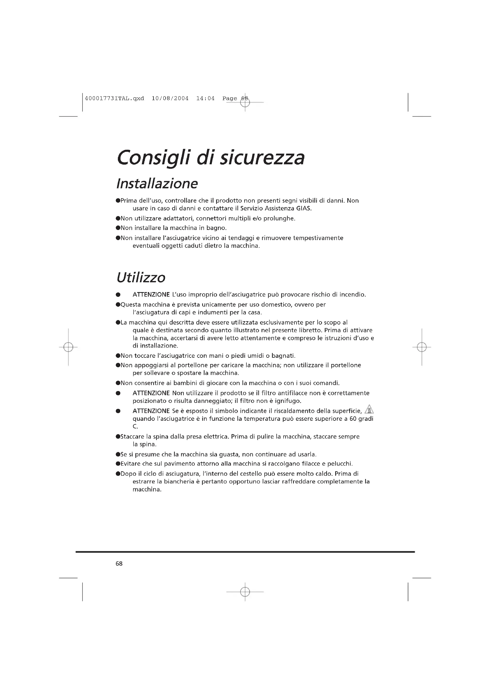 IIMMPPOORRTTAANNTTEE PPrriimmaa ddii pprroocceeddeerree aallllaa ppuulliizziiaa,, ddiissaattttiivvaarree sseemmpprree llaa mmaacccchhiinnaa ee ssttaaccccaarree llaa ssppiinnaa ddaallllaa pprreessaa aa mmuurroo.. PPeerr ii ddaattii eelleettttrriiccii vveeddeerree llaa ttaarrgghheettttaa ddeeii ddaattii ppoossttaa ssuull ddaavvaannttii ddeell mmoobbiillee ddeellllaa mmaacccchhiinnaa ((ccoonn ppoorrtteelllloonnee aappeerrttoo)).. PPuulliizziiaa ee mmaannuutteennzziioonnee oorrddiinnaarriiaa 40001773ITAL.qxd 10/08/2004 14:04 Page 7980 QQuuaallee ppuuòò eesssseerree llaa ccaauussaa...... PPrroobblleemmii cchhee ppuuòò rriissoollvveerree ll’’uutteennttee Prima di rivolgersi al Centro Assistenza GIAS, consultare la seguente checklist. La chiamata verrà addebitata all’utente nel caso in cui risulti che la macchina funziona o è stata installata o utilizzata in maniera errata. Se il problema persiste anche dopo aver eseguito i controlli consigliati, rivolgersi al servizio di assistenza GIAS che sarà a disposizione per suggerire eventuali soluzioni per telefono. TTeemmppoo ddii aasscciiuuggaattuurraa eecccceessssiivvaammeennttee lluunnggoo//ccaappii nnoonn ssuuffffiicciieenntteemmeennttee aasscciiuuttttii…… ● Il programma/tempo di asciugatura selezionato è corretto? ● I capi sono stati introdotti eccessivamente bagnati? Si è provveduto a strizzare o centrifugare adeguatamente i capi prima d’introdurli nella macchina? ● Si deve pulire il filtro? ● L’asciugatrice è stata caricata eccessivamente? ● Il tubo di sfiato è piegato o bloccato? ● Il tasto è stato selezionato da un ciclo precedente? LL’’aasscciiuuggaattrriiccee nnoonn ffuunnzziioonnaa…… ● L’alimentazione elettrica cui è collegata la macchina è attiva? Controllare provando con un altro apparecchio (ad esempio, lampada da tavolo). ● La spina di alimentazione è stata collegata correttamente all’alimentazione elettrica? ● Manca la corrente? ● Fusibile bruciato? ● Il portellone è stato chiuso perfettamente? ● La macchina è stata opportunamente attivata (sia collegata all’alimentazione sia attivata localmente)? ● È stato selezionato il tempo o il programma di asciugatura? ● La macchina è stata riattivata dopo aver aperto il portellone? LL’’aasscciiuuggaattrriiccee ffaa mmoollttoo rruummoorree…… ● Spegnere l’asciugatrice e rivolgersi al Servizio Assistenza GIAS. LLaa ssppiiaa ddii sseeggnnaallaazziioonnee PPuulliizziiaa ffiillttrroo èè aacccceessaa…… ● Si deve pulire il filtro? ● Il tubo di sfiato è piegato o bloccato? RRiicceerrccaa gguuaassttii 40001773ITAL.qxd 10/08/2004 14:04 Page 80Se il problema persiste anche dopo aver effettuato tutti i controlli consigliati, rivolgersi al Servizio Assistenza GIAS. Sarà a disposizione per suggerire eventuali soluzioni per telefono o per fissare la visita del tecnico in base alle condizioni di garanzia. Si ricorda che l’intervento del tecnico può essere soggetto a pagamento nel caso la macchina: ● risulti perfettamente funzionante. ● non sia stata installata secondo quanto indicato nelle istruzioni d’installazione. ● sia stata utilizzata in modo improprio. RRiiccaammbbii UUttiilliizzzzaarree sseemmpprree rriiccaammbbii oorriiggiinnaallii,, ddiissppoonniibbiillii ddiirreettttaammeennttee pprreessssoo iill SSeerrvviizziioo AAssssiisstteennzzaa GGIIAASS.. SSeerrvviizziioo GGIIAASS PPeerr aassssiisstteennzzaa ee rriippaarraazziioonnii,, rriivvoollggeerrssii aall tteeccnniiccoo ddeell SSeerrvviizziioo AAssssiisstteennzzaa GGIIAASS ppiiùù vviicciinnoo.. Il produttore declina ogni responsabilità in caso di eventuali errori di stampa nel presente opuscolo. Il produttore si riserva il diritto di apportare le necessarie modifiche ai propri prodotti senza modificarne le caratteristiche essenziali.