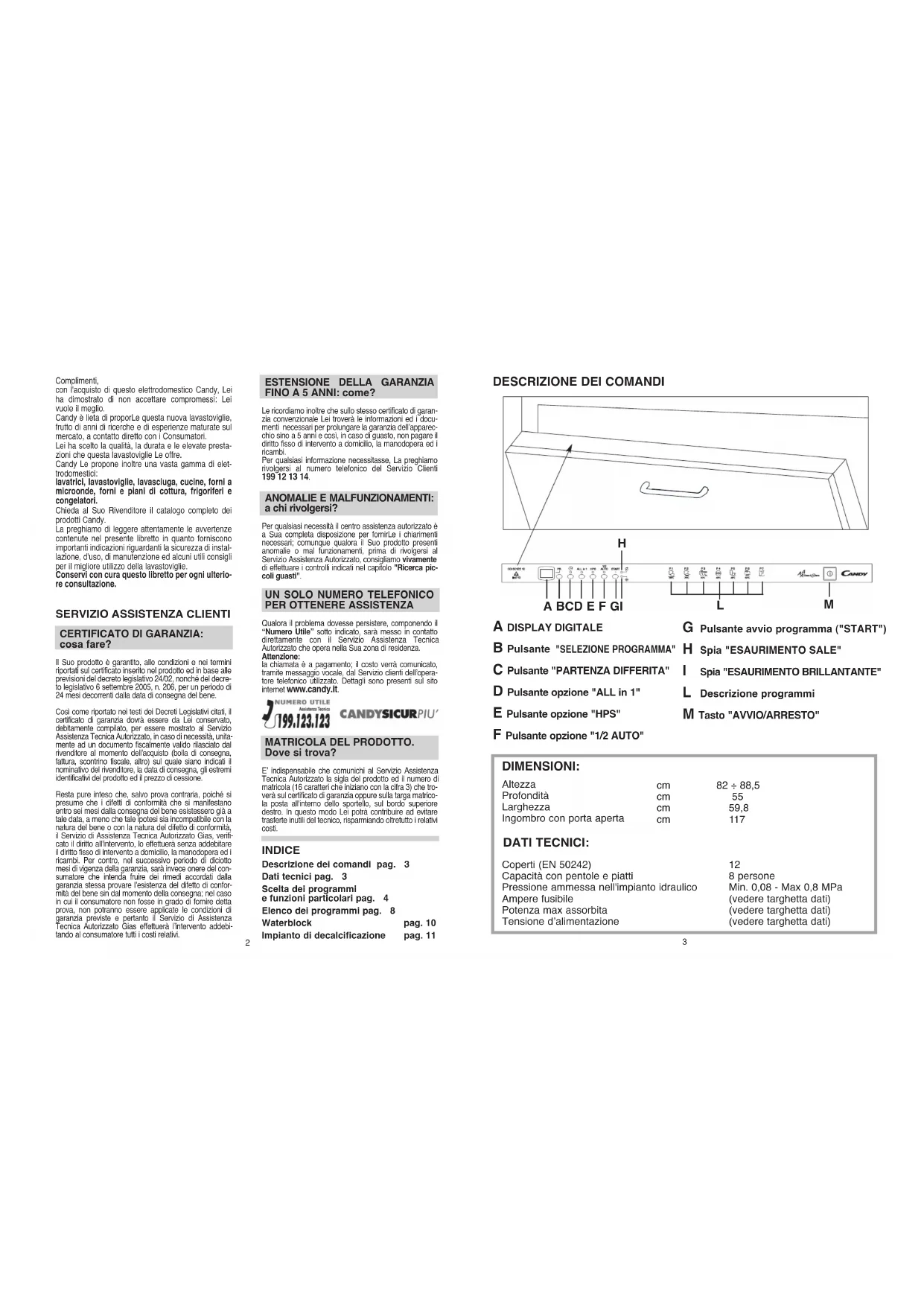 Qualora il problema dovesse persistere, componendo il“Numero Utile” sotto indicato, sarà messo in contattodirettamente con il Servizio Assistenza TecnicaAutorizzato che opera nella Sua zona di residenza.Attenzione:la chiamata è a pagamento; il costo verrà comunicato,tramite messaggio vocale, dal Servizio clienti dell’opera-tore telefonico utilizzato. Dettagli sono presenti sul sitointernet www.candy.it. MATRICOLA DEL PRODOTTO. Dove si trova? E’ indispensabile che comunichi al Servizio AssistenzaTecnica Autorizzato la sigla del prodotto ed il numero dimatricola (16 caratteri che iniziano con la cifra 3) che tro-verà sul certificato di garanzia oppure sulla targa matrico-la posta all'interno dello sportello, sul bordo superioredestro. In questo modo Lei potrà contribuire ad evitaretrasferte inutili del tecnico, risparmiando oltretutto i relativicosti. INDICE Descrizione dei comandi pag. 3 Dati tecnici pag. 3 Scelta dei programmi e funzioni particolari pag. 4 Elenco dei programmi pag. 8 Waterblock pag. 10 Impianto di decalcificazione pag. 114