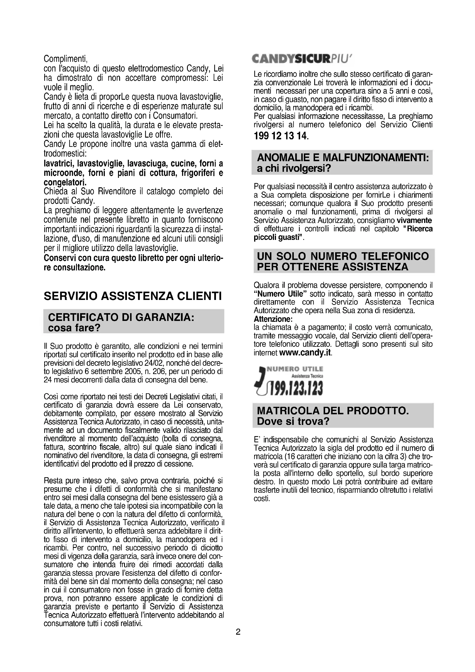 Qualora il problema dovesse persistere, componendo il “Numero Utile” sotto indicato, sarà messo in contatto direttamente con il Servizio Assistenza Tecnica Autorizzato che opera nella Sua zona di residenza. Attenzione: la chiamata è a pagamento; il costo verrà comunicato, tramite messaggio vocale, dal Servizio clienti dell’opera- tore telefonico utilizzato. Dettagli sono presenti sul sito internet www.candy.it. MATRICOLA DEL PRODOTTO. Dove si trova? E’ indispensabile che comunichi al Servizio Assistenza Tecnica Autorizzato la sigla del prodotto ed il numero di matricola (16 caratteri che iniziano con la cifra 3) che tro- verà sul certificato di garanzia oppure sulla targa matrico- la posta all'interno dello sportello, sul bordo superiore destro. In questo modo Lei potrà contribuire ad evitare trasferte inutili del tecnico, risparmiando oltretutto i relativi costi.3