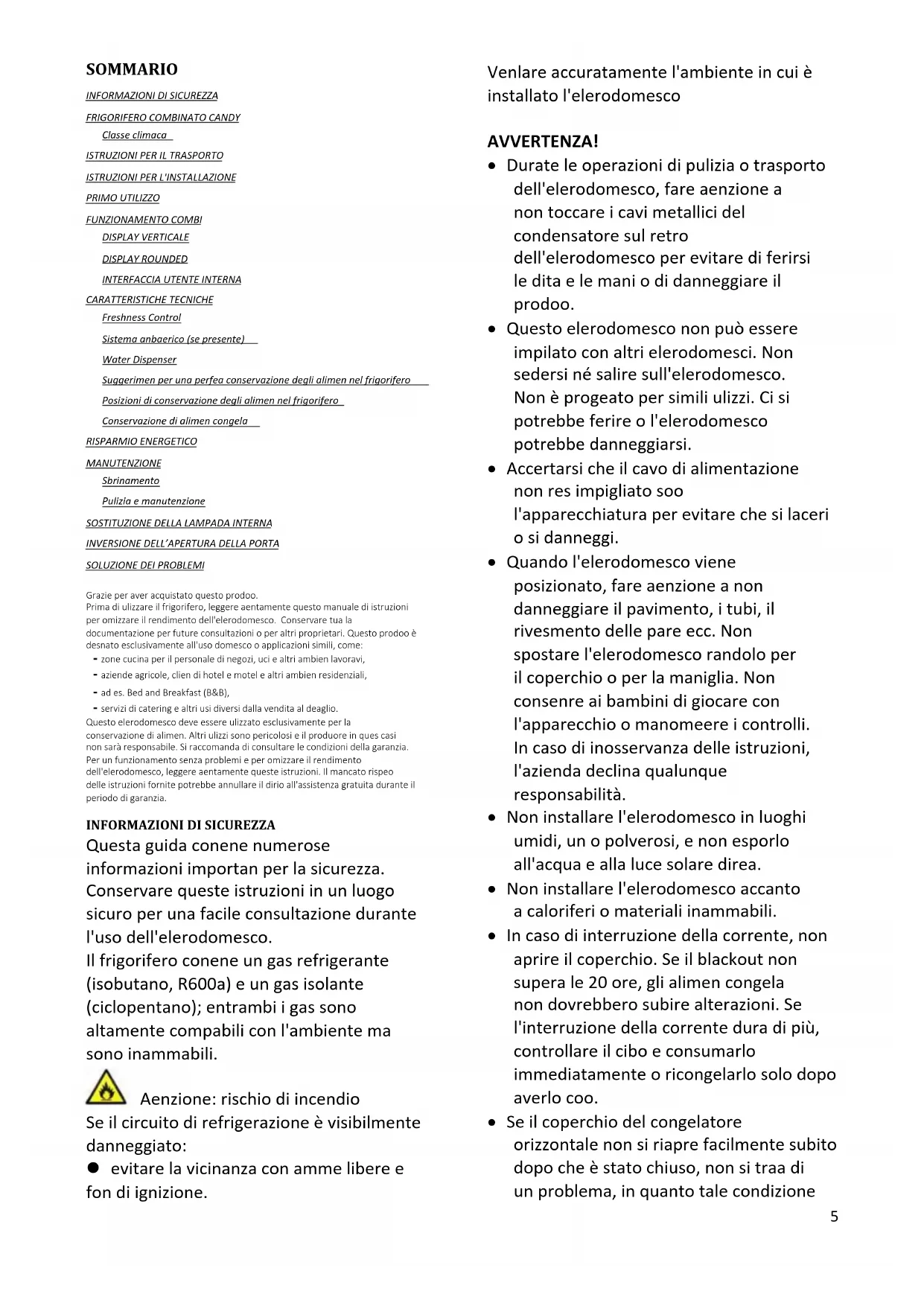 Non smalre l'elerodomesco nel fuoco. Fare aenza e non danneggiare il circuito/i tubi di rareddamento dell'elerodomesco durante il trasporto e l'uso. In caso di danni, non esporre l'elerodomco al fuoco o a potenziali fon di ignizione, e venlare immediatamente l'ambiente in cui è installato.