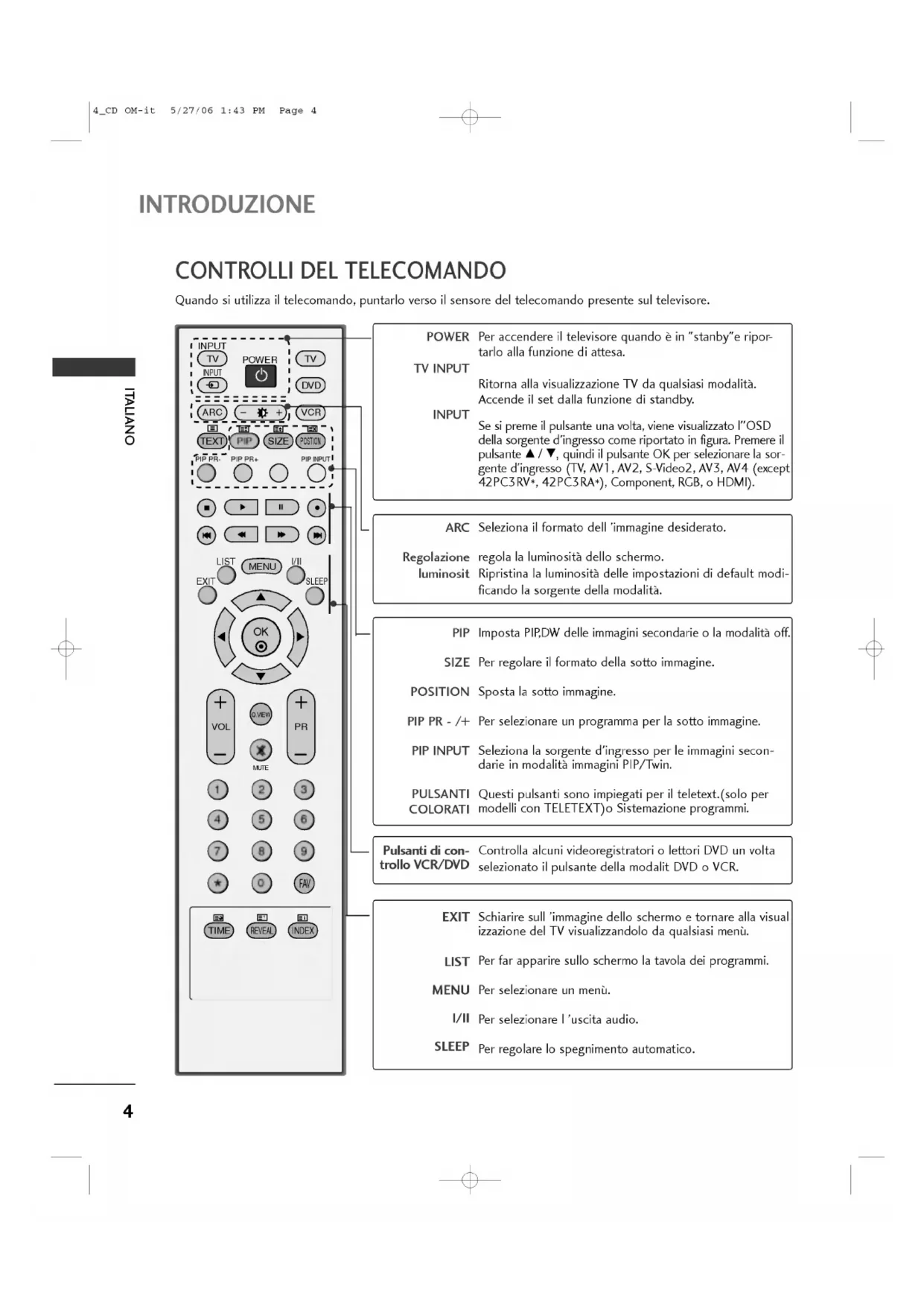 Component, RGB, HDMI). ARCRegolazioneluminositSelezionailformatodell 'immagine desiderato.regolalaluminositadelloschermo. Ripristina laluminosita delle impostazioni didefaultmodi-ficandolasorgentedella modalita.PIPSIZEPOSITION PIPPR-/+ PIPINPUTPULSANTICOLORATI Imposta PIP,DW delle immagini secondarieolamodalitaoff.Perregolareilformatodella sotto immagine. Sposta sotto immagine. Perselezionareunprogrammaperla sotto immagine. Selezionalasorgented'ingressoperle immagini secon-darieinmodalita immagini PIP/Twin. Questi pulsantisono impiegati peril teletext.(solo permodellicon TELETEXT)o Sistemazione programmi. Pulsantidi con- trollo VCR/DVD ControllaalcunivideoregistratoriolettoriDVDunvoltaselezionatoilpulsantedellamodalitDVDoVCR. EXIT LIST MENU I/II SLEEP Schiariresull 'immagine delloschermoe tornare allavisualizzazionedelTVvisualizzandolodaqualsiasi menu. Perfar apparire sulloschermolatavoladei programmi. Perselezionareun menu. Perselezionarel'uscitaaudio.Perregolarelo spegnimento automatico. 4_CD OM-it 5/27/06 1:43 Page