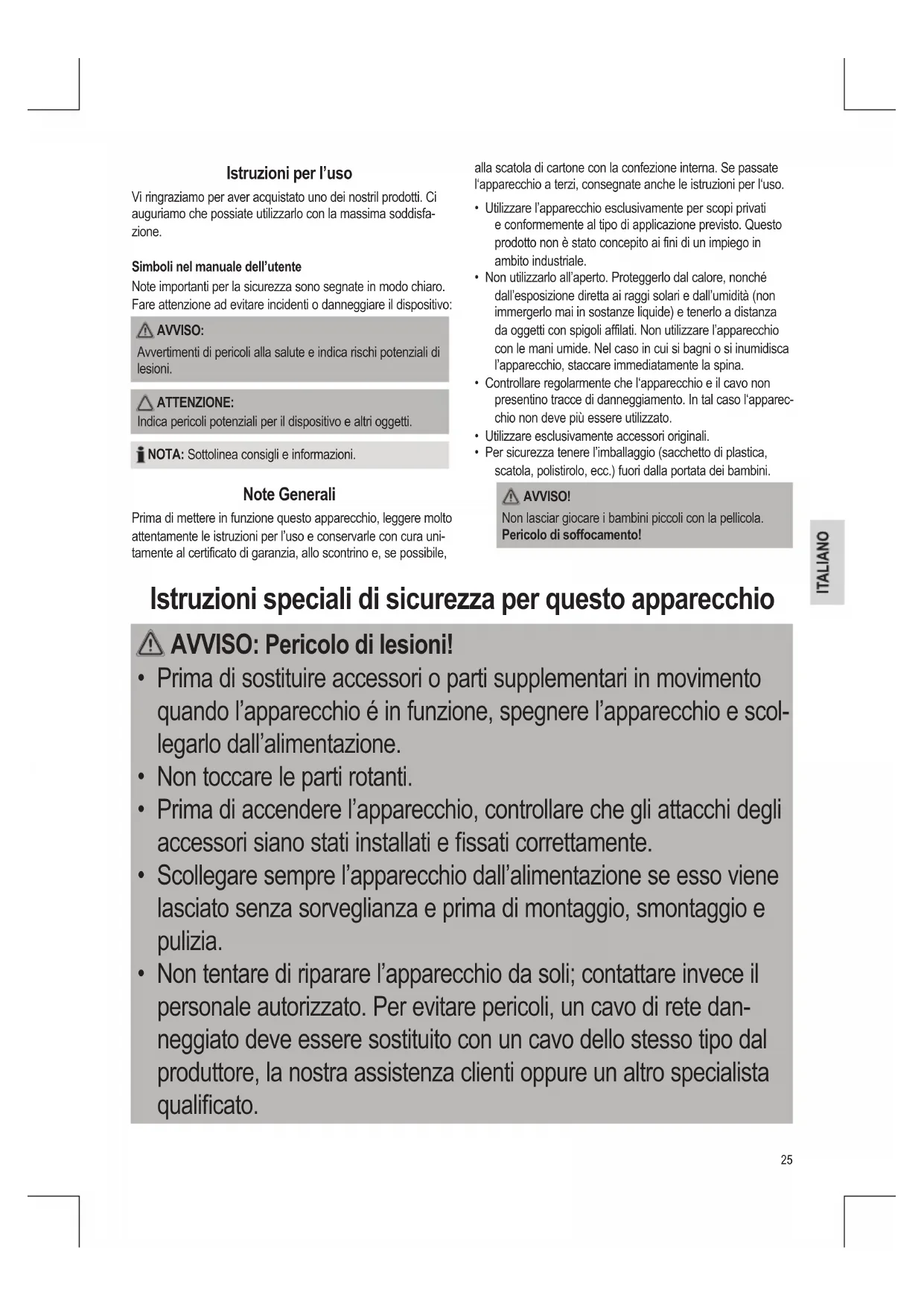 - Per sicurezza tenere l’imballaggio (sacchetto di plastica, scatola, polistirolo, ecc.) fuori dalla portata dei bambini. AVVISO! Non lasciar giocare i bambini piccoli con la pellicola. Pericolo di soffocamento! Istruzioni speciali di sicurezza per questo apparecchio AVVISO: Pericolo di lesioni!