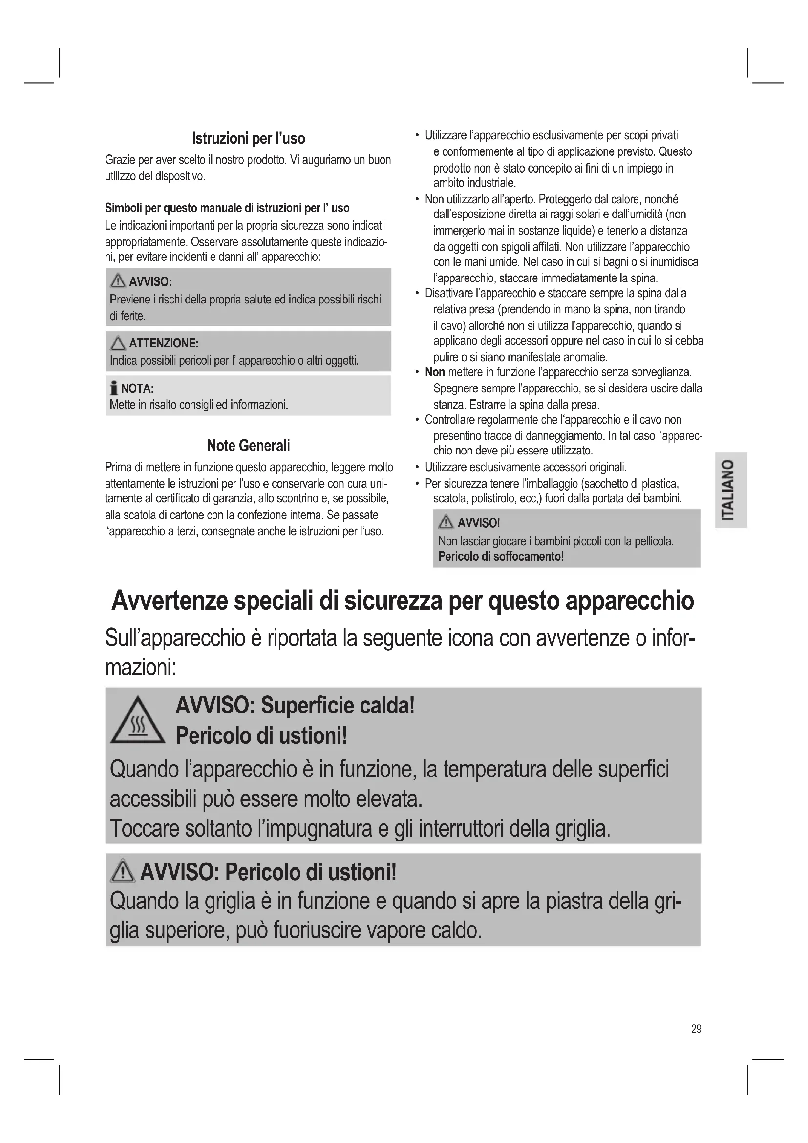 - Per sicurezza tenere l’imballaggio (sacchetto di plastica, scatola, polistirolo, ecc,) fuori dalla portata dei bambini. AVVISO! Non lasciar giocare i bambini piccoli con la pellicola. Pericolo di soffocamento! Istruzioni per l’uso Grazie per aver scelto il nostro prodotto. Vi auguriamo un buon utilizzo del dispositivo. Simboli per questo manuale di istruzioni per l’ uso Le indicazioni importanti per la propria sicurezza sono indicati appropriatamente. Osservare assolutamente queste indicazio- ni, per evitare incidenti e danni all’ apparecchio: AVVISO: Previene i rischi della propria salute ed indica possibili rischi di ferite. ATTENZIONE: Indica possibili pericoli per l’ apparecchio o altri oggetti. NOTA: Mette in risalto consigli ed informazioni. Note Generali Prima di mettere in funzione questo apparecchio, leggere molto attentamente le istruzioni per l’uso e conservarle con cura uni- tamente al certicato di garanzia, allo scontrino e, se possibile, alla scatola di cartone con la confezione interna. Se passate l‘apparecchio a terzi, consegnate anche le istruzioni per l‘uso. Avvertenze speciali di sicurezza per questo apparecchio Sull’apparecchio è riportata la seguente icona con avvertenze o infor- mazioni: AVVISO: Supercie calda! Pericolo di ustioni! Quando l’apparecchio è in funzione, la temperatura delle superci accessibili può essere molto elevata. Toccare soltanto l’impugnatura e gli interruttori della griglia. AVVISO: Pericolo di ustioni! Quando la griglia è in funzione e quando si apre la piastra della gri- glia superiore, può fuoriuscire vapore caldo.30 ATTENZIONE: Pericolo d’incendio! Olio e grasso possono incendiarsi se surriscaldati. Collocare l’ap- parecchio a distanza di sicurezza (30 cm) da materiali inammabili come mobile, tende ecc.