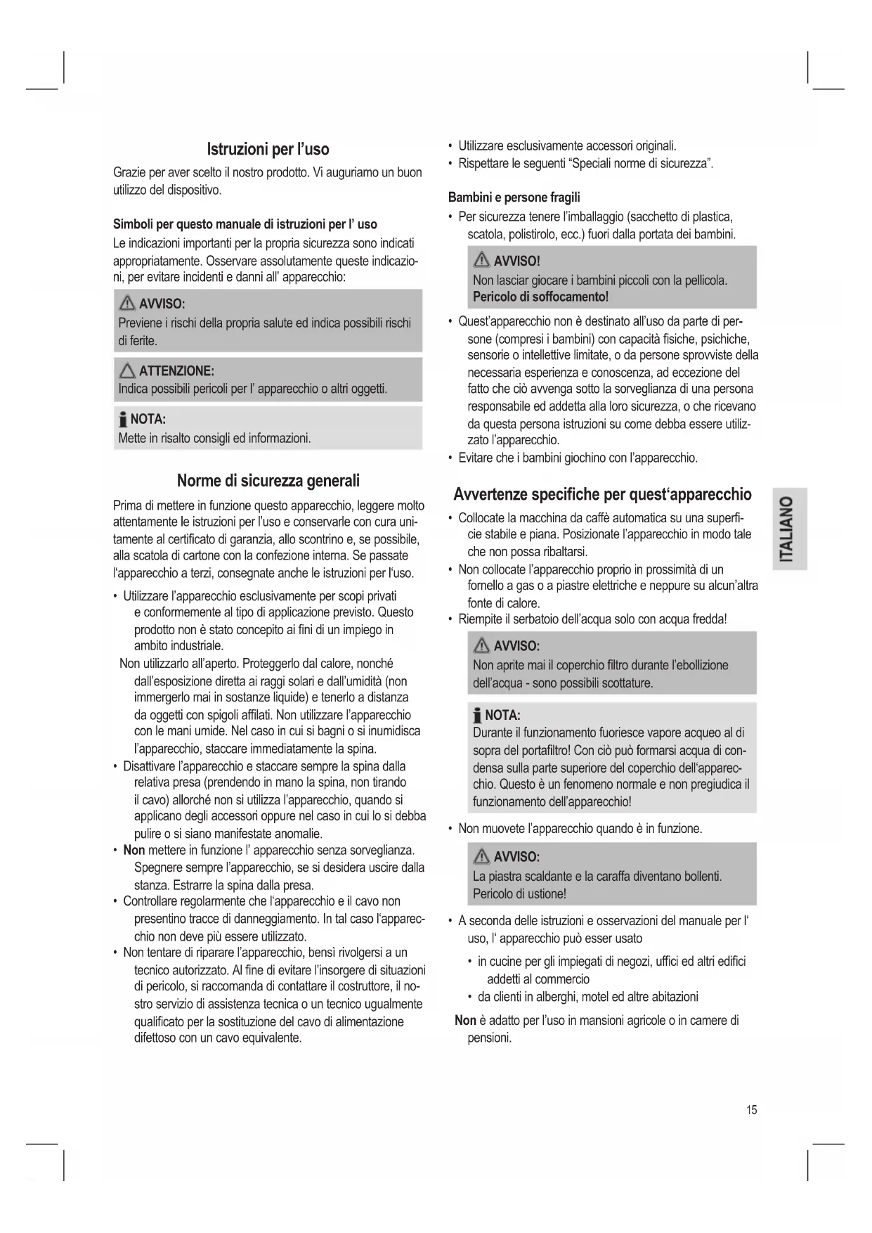 - Non muovete l’apparecchio quando è in funzione. AVVISO: La piastra scaldante e la caraffa diventano bollenti. Pericolo di ustione!
