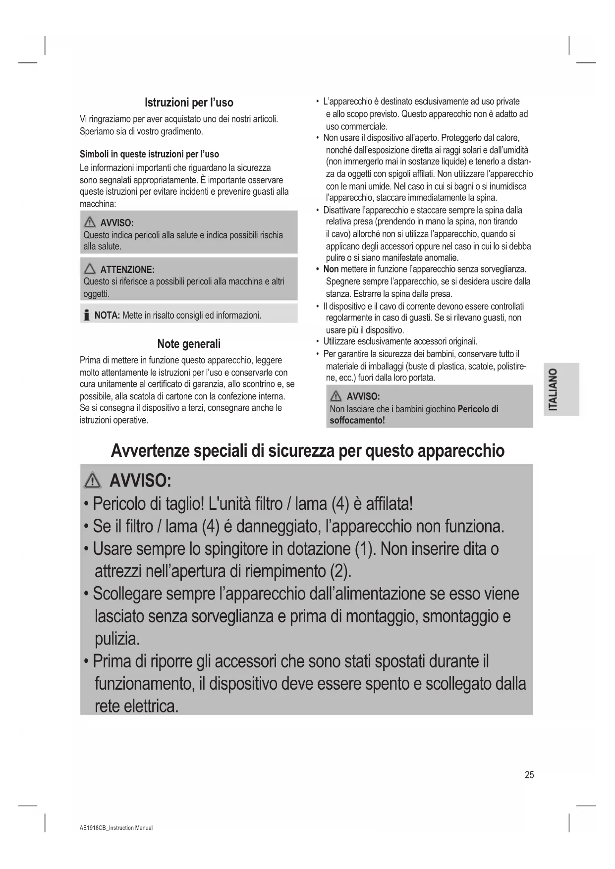 - Conservare sempre l’apparecchio in un luogo asciutto e ben ventilato al di fuori della portata dei bambini.29 AE1918CB_Instruction Manual 26.10.16 Dati tecnici Modello:. ................................................................ AE 1918 CB Alimentazione:........................................220 - 240 V~ 50 / 60 Hz Consumo energetico: ...................................................... 400 W Livello di pressione del suono: .................................... 71 dB(A) Codice di protezione: .............................................................. Operazione di breve durata / pausa: ........................6 / 5 minuti Peso netto: .................................................................... ca. 2 kg Si riserva il diritto di apportare modiche tecniche e di design nel corso dello sviluppo del prodotto. Questo apparecchio è stato controllato sulla base di tutte le direttive CE attuali in vigore in questo settore, quali per esem- pio la normativa in materia di compatibilità elettromagnetica e la direttiva in materia di bassa tensione, ed è stato costruito conformemente alle norme di sicurezza più moderne. Smaltimento Signicato del simbolo “Cassonetto con ruote” Rispettare l’ambiente, non smaltire dispositivi elettrici nei riuti domestici. Lo smaltimento di dispositivi obsoleti o difettosi deve avvenire tramite consegna presso punti di raccolta locali. Aiutate ad evitare pericoli potenziali per l'ambiente e la nostra salute tramite uno smaltimento non corretto. Voi contribuite al riciclaggio e altro forme di utilizzo di disposi- tivi elettrici e elettronici. Il vostro comune è in grado di fornirvi informazioni sui punti di raccolta. Isoluzione di problemi Problema di funzionamento Possibili cause Soluzione L'apparecchio non funziona. L’apparecchio non è collegato all’ali- mentazione. Controllare la presa inserendovi la spina di un altro apparec- chio. Inserire la spina correttamente. Controllare il fusibile domestico. L’impugnatura di sicurezza (8) non è stata chiusa. Controllare che tutti i componenti siano montati correttamente. L’apparecchio é difettoso. Contattare il centro assistenza o una tecnico qualicato. Quantitá di succo insuf- ciente. Tipo errato di frutto. Selezionare un frutto in grado di produrre una quantità maggio- re di succo. Non è possibile estrarre il succo da frutti di bosco piccoli nel ltro / lama (4). Troppi residui nel ltro / lama (4). Pulire il ltro / lama (4). Rumore forte e non bilanciato durante il funzio- namento. Montaggio errato. Controllare che tutti i componenti siano installati correttamente. Troppi residui nel ltro / lama (4). Quando si spremono grandi quantitá di frutta, pulire il ltro / lama (4) tra un funzionamento e l’altro.30 AE1918CB_Instruction Manual 26.10.16 Instruction Manual Thank you for choosing our product. We hope you will enjoy using the appliance. Symbols in these Instructions for Use Important information for your safety is specially marked. It is essential to comply with these instructions in order to avoid accidents and prevent damage to the appliance: