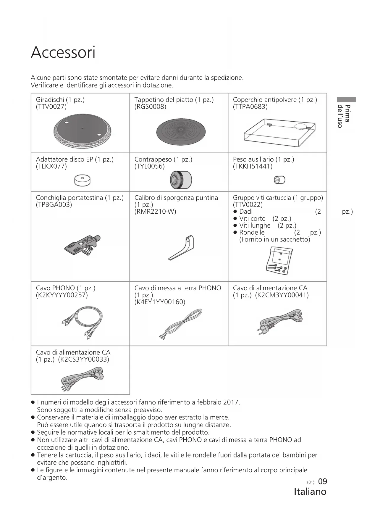 Alcune parti sono state smontate per evitare danni durante la spedizione. Verificare e identificare gli accessori in dotazione. Giradischi (1 pz.) (TTV0027) Tappetino del piatto (1 pz.) (RGS0008) Coperchio antipolvere (1 pz.) (TTPA0683) Adattatore disco EP (1 pz.) (TEKX077) Contrappeso (1 pz.) (TYL0056) Peso ausiliario (1 pz.) (TKKH51441) Conchiglia portatestina (1 pz.) (TPBGA003) Calibro di sporgenza puntina (1 pz.) (RMR2210-W) Gruppo viti cartuccia (1 gruppo) (TTV0022)