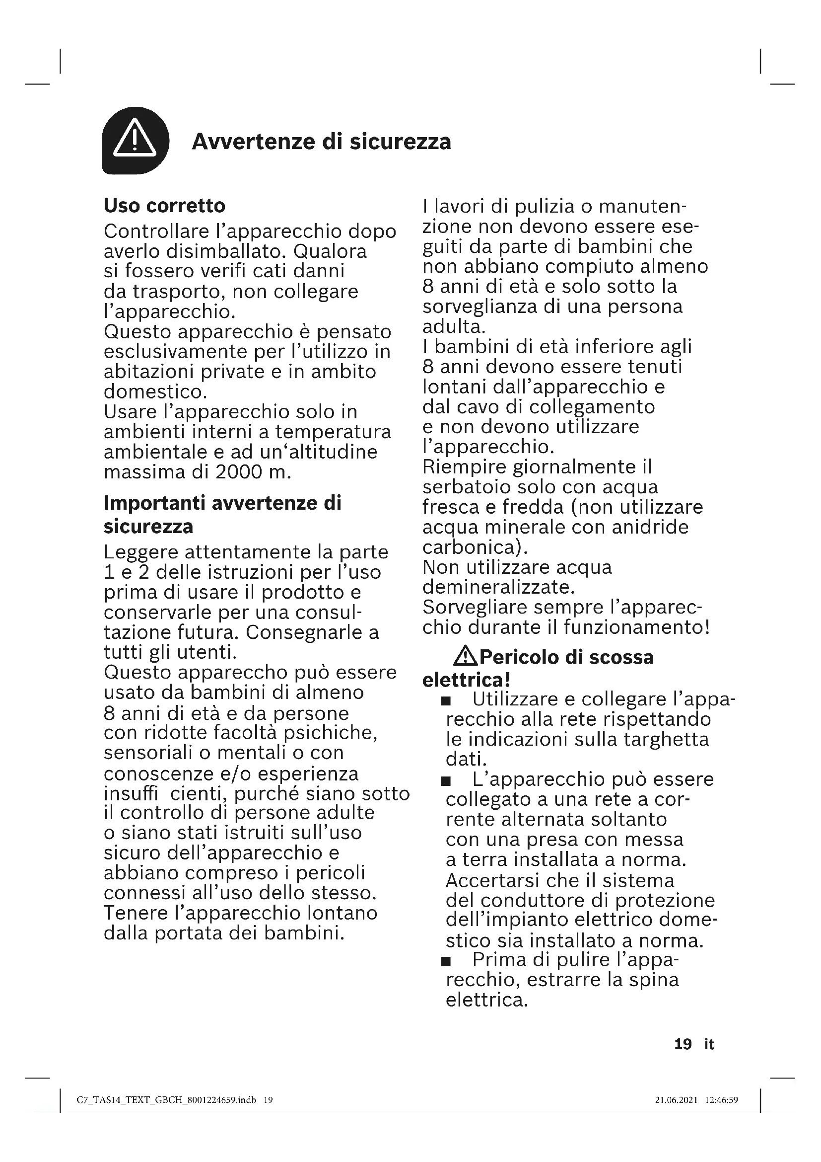 I lavori di pulizia o manuten- zione non devono essere ese- guiti da parte di bambini che non abbiano compiuto almeno 8 anni di età e solo sotto la sorveglianza di una persona adulta. I bambini di età inferiore agli 8 anni devono essere tenuti lontani dall’apparecchio e dal cavo di collegamento e non devono utilizzare l’apparecchio. Riempire giornalmente il serbatoio solo con acqua fresca e fredda (non utilizzare acqua minerale con anidride carbonica). Non utilizzare acqua demineralizzate. Sorvegliare sempre l’apparec- chio durante il funzionamento! W Pericolo di scossa elettrica! ■ Utilizzare e collegare l’appa- recchio alla rete rispettando le indicazioni sulla targhetta dati. ■ L’apparecchio può essere collegato a una rete a cor- rente alternata soltanto con una presa con messa a terra installata a norma. Accertarsi che ilsistema delconduttore diprotezione dell’impianto elettrico dome- stico sia installato anorma. ■ Prima di pulire l’appa- recchio, estrarre la spina elettrica. Uso corretto Controllare l’apparecchio dopo averlo disimballato. Qualora si fossero veri cati danni da trasporto, non collegare l’apparecchio. Questo apparecchio è pensato esclusivamente per l’utilizzo in abitazioni private e in ambito domestico. Usare l’apparecchio solo in ambienti interni a temperatura ambientale e ad un‘altitudine massima di 2000 m. Importanti avvertenze di sicurezza Leggere attentamente la parte 1 e 2 delle istruzioni per l’uso prima di usare il prodotto e conservarle per una consul- tazione futura. Consegnarle a tutti gli utenti. Questo appareccho può essere usato da bambini di almeno 8anni di età e da persone con ridotte facoltà psichiche, sensoriali o mentali o con conoscenze e/o esperienza insuffi cienti, purché siano sotto il controllo di persone adulte o siano stati istruiti sull’uso sicuro dell’apparecchio e abbiano compreso i pericoli connessi all’uso dello stesso. Tenere l’apparecchio lontano dalla portata dei bambini. C7_TAS14_TEXT_GBCH_8001224659.indb 19C7_TAS14_TEXT_GBCH_8001224659.indb 19 21.06.2021 12:46:5921.06.2021 12:46:5920