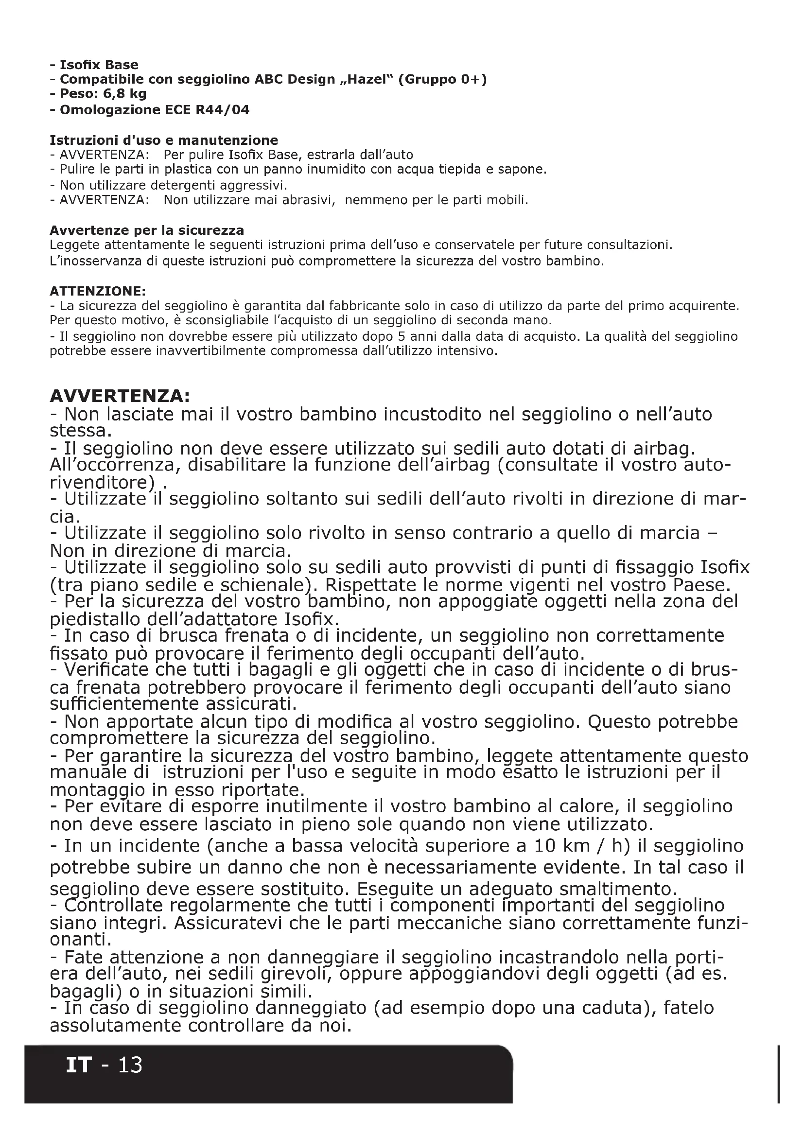 a. Tirez le dispositif de déverrouillage (3) des deux côtés jusqu'à ce que l'indicateur de couleur soit rouge. Vous pouvez à présent retirer la Base du dispositif Isox de votre voiture. b. Tirez le logement de xation en arrière. Saisissez simplement la pièce en plastique pour déverrouiller les bras de xation (5) et tirez la barre en arriè- re. c. Basculez les bras de xation en arrière en appuyant sur la poignée de déverrouillage (5). d. Appuyez sur la poignée de déverrouillage de la barre d'amortissement (4) et repliez la barre. e. Appuyez sur le bouton rouge de réglage du pied et raccourcissez le pied le plus possible. Repliez le pied.IT - 13 - Isox Base - Compatibile con seggiolino ABC Design „Hazel“ (Gruppo 0+) - Peso: 6,8 kg - Omologazione ECE R44/04 Istruzioni d'uso e manutenzione - AVVERTENZA: Per pulire Isox Base, estrarla dall’auto - Pulire le parti in plastica con un panno inumidito con acqua tiepida e sapone. - Non utilizzare detergenti aggressivi. - AVVERTENZA: Non utilizzare mai abrasivi, nemmeno per le parti mobili. Avvertenze per la sicurezza Leggete attentamente le seguenti istruzioni prima dell’uso e conservatele per future consultazioni. L’inosservanza di queste istruzioni può compromettere la sicurezza del vostro bambino. ATTENZIONE: - La sicurezza del seggiolino è garantita dal fabbricante solo in caso di utilizzo da parte del primo acquirente. Per questo motivo, è sconsigliabile l’acquisto di un seggiolino di seconda mano. - Il seggiolino non dovrebbe essere più utilizzato dopo 5 anni dalla data di acquisto. La qualità del seggiolino potrebbe essere inavvertibilmente compromessa dall’utilizzo intensivo. AVVERTENZA: - Non lasciate mai il vostro bambino incustodito nel seggiolino o nell’auto stessa. - Il seggiolino non deve essere utilizzato sui sedili auto dotati di airbag. All’occorrenza, disabilitare la funzione dell’airbag (consultate il vostro auto- rivenditore) . - Utilizzate il seggiolino soltanto sui sedili dell’auto rivolti in direzione di mar- cia. - Utilizzate il seggiolino solo rivolto in senso contrario a quello di marcia – Non in direzione di marcia. - Utilizzate il seggiolino solo su sedili auto provvisti di punti di ssaggio Isox (tra piano sedile e schienale). Rispettate le norme vigenti nel vostro Paese. - Per la sicurezza del vostro bambino, non appoggiate oggetti nella zona del piedistallo dell’adattatore Isox. - In caso di brusca frenata o di incidente, un seggiolino non correttamente ssato può provocare il ferimento degli occupanti dell’auto. - Vericate che tutti i bagagli e gli oggetti che in caso di incidente o di brus- ca frenata potrebbero provocare il ferimento degli occupanti dell’auto siano sucientemente assicurati. - Non apportate alcun tipo di modica al vostro seggiolino. Questo potrebbe compromettere la sicurezza del seggiolino. - Per garantire la sicurezza del vostro bambino, leggete attentamente questo manuale di istruzioni per l'uso e seguite in modo esatto le istruzioni per il montaggio in esso riportate. - Per evitare di esporre inutilmente il vostro bambino al calore, il seggiolino non deve essere lasciato in pieno sole quando non viene utilizzato. - In un incidente (anche a bassa velocità superiore a 10 km / h) il seggiolino potrebbe subire un danno che non è necessariamente evidente. In tal caso il seggiolino deve essere sostituito. Eseguite un adeguato smaltimento. - Controllate regolarmente che tutti i componenti importanti del seggiolino siano integri. Assicuratevi che le parti meccaniche siano correttamente funzi- onanti. - Fate attenzione a non danneggiare il seggiolino incastrandolo nella porti- era dell’auto, nei sedili girevoli, oppure appoggiandovi degli oggetti (ad es. bagagli) o in situazioni simili. - In caso di seggiolino danneggiato (ad esempio dopo una caduta), fatelo assolutamente controllare da noi.IT - 14