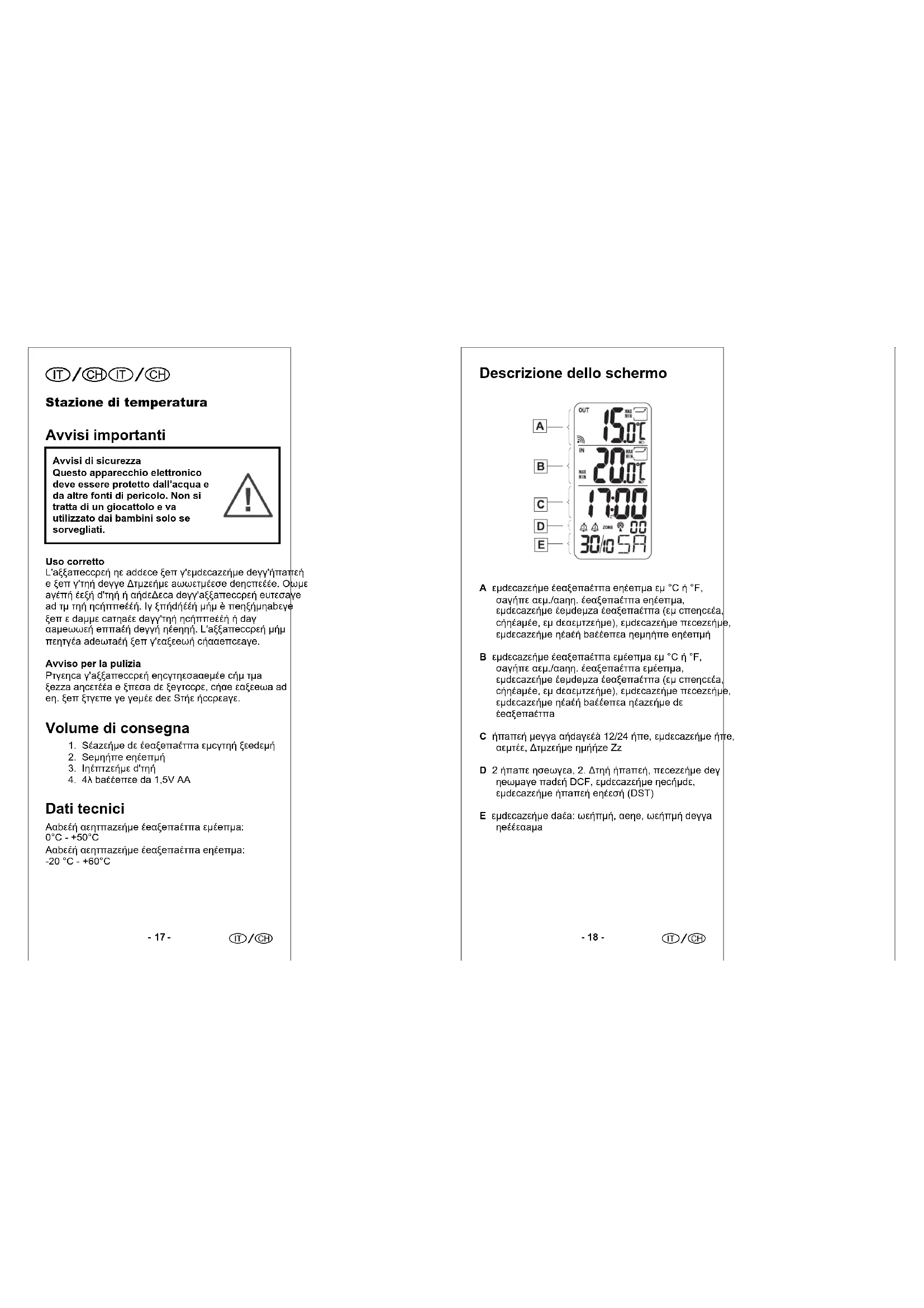 Stazione di temperatura Avvisi importanti Avvisi di sicurezza Questo apparecchio elettronico deve essere protetto dall'acqua e da altre fonti di pericolo. Non si tratta di un giocattolo e va utilizzato dai bambini solo se sorvegliati.