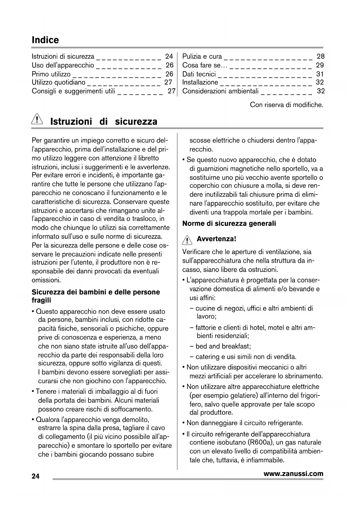 www.zanussi.comIndice Istruzioni di sicurezza _ _ _ _ _ _ _ _ _ _ _ _ 24 Uso dell'apparecchio _ _ _ _ _ _ _ _ _ _ _ _ 26 Primo utilizzo _ _ _ _ _ _ _ _ _ _ _ _ _ _ _ _ 26 Utilizzo quotidiano _ _ _ _ _ _ _ _ _ _ _ _ _ _ 27 Consigli e suggerimenti utili _ _ _ _ _ _ _ _ 27 Pulizia e cura _ _ _ _ _ _ _ _ _ _ _ _ _ _ _ _ 28 Cosa fare se… _ _ _ _ _ _ _ _ _ _ _ _ _ _ _ 29 Dati tecnici _ _ _ _ _ _ _ _ _ _ _ _ _ _ _ _ _ 31 Installazione _ _ _ _ _ _ _ _ _ _ _ _ _ _ _ _ _ 32 Considerazioni ambientali _ _ _ _ _ _ _ _ _ 32 Con riserva di modifiche. Istruzioni di sicurezza Per garantire un impiego corretto e sicuro del- l'apparecchio, prima dell'installazione e del pri- mo utilizzo leggere con attenzione il libretto istruzioni, inclusi i suggerimenti e le avvertenze. Per evitare errori e incidenti, è importante ga- rantire che tutte le persone che utilizzano l'ap- parecchio ne conoscano il funzionamento e le caratteristiche di sicurezza. Conservare queste istruzioni e accertarsi che rimangano unite al- l'apparecchio in caso di vendita o trasloco, in modo che chiunque lo utilizzi sia correttamente informato sull'uso e sulle norme di sicurezza. Per la sicurezza delle persone e delle cose os- servare le precauzioni indicate nelle presenti istruzioni per l'utente, il produttore non è re- sponsabile dei danni provocati da eventuali omissioni. Sicurezza dei bambini e delle persone fragili
