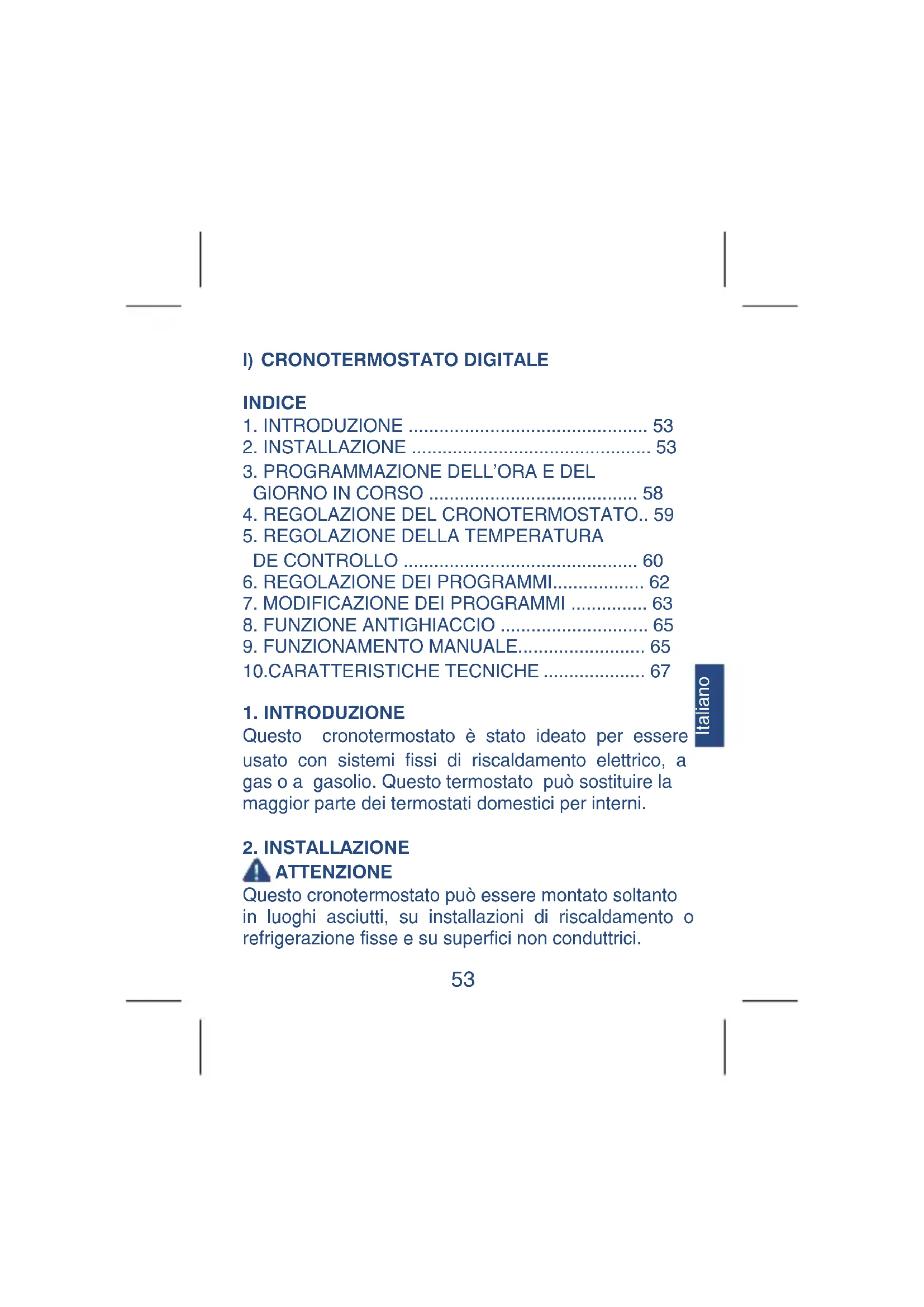 ATTENZIONE Questo cronotermostato può essere montato soltanto in luoghi asciutti, su installazioni di riscaldamento o refrigerazione fisse e su superfici non conduttrici.54 Italiano