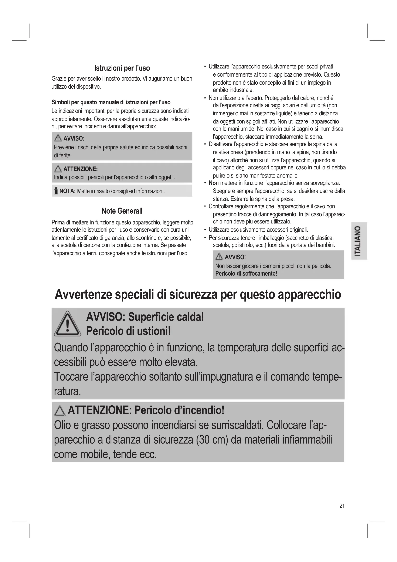 - Per sicurezza tenere l’imballaggio (sacchetto di plastica, scatola, polistirolo, ecc,) fuori dalla portata dei bambini. AVVISO! Non lasciar giocare i bambini piccoli con la pellicola. Pericolo di soffocamento! Istruzioni per l’uso Grazie per aver scelto il nostro prodotto. Vi auguriamo un buon utilizzo del dispositivo. Simboli per questo manuale di istruzioni per l’uso Le indicazioni importanti per la propria sicurezza sono indicati appropriatamente. Osservare assolutamente queste indicazio- ni, per evitare incidenti e danni all’apparecchio: AVVISO: Previene i rischi della propria salute ed indica possibili rischi di ferite. ATTENZIONE: Indica possibili pericoli per l’apparecchio o altri oggetti. NOTA: Mette in risalto consigli ed informazioni. Note Generali Prima di mettere in funzione questo apparecchio, leggere molto attentamente le istruzioni per l’uso e conservarle con cura uni- tamente al certicato di garanzia, allo scontrino e, se possibile, alla scatola di cartone con la confezione interna. Se passate l‘apparecchio a terzi, consegnate anche le istruzioni per l‘uso. Avvertenze speciali di sicurezza per questo apparecchio AVVISO: Supercie calda! Pericolo di ustioni! Quando l’apparecchio è in funzione, la temperatura delle superci ac- cessibili può essere molto elevata. Toccare l’apparecchio soltanto sull’impugnatura e il comando tempe- ratura. ATTENZIONE: Pericolo d’incendio! Olio e grasso possono incendiarsi se surriscaldati. Collocare l’ap- parecchio a distanza di sicurezza (30 cm) da materiali inammabili come mobile, tende ecc.22 ATTENZIONE: Quest’apparecchio non deve essere immerse in acqua per essere pulito. Consultare le istruzioni fornite nel capitolo “Pulizia”.