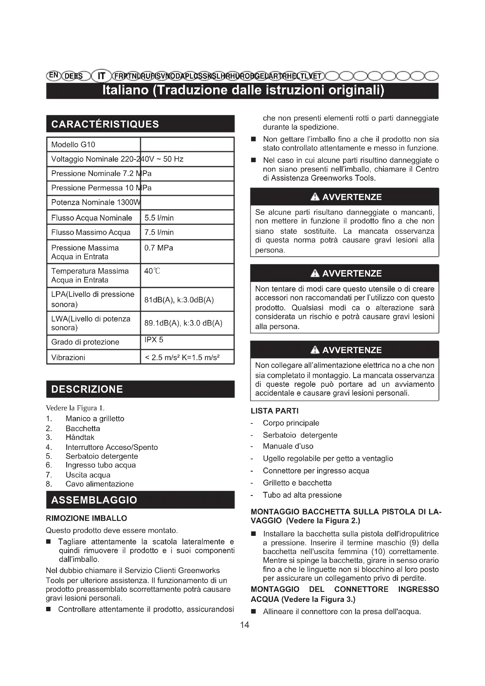 ASSEMBLAGGIO RIMOZIONE IMBALLO Questo prodotto deve essere montato. Tagliare attentamente la scatola lateralmente e quindi rimuovere il prodotto e i suoi componenti dall’imballo. Nel dubbio chiamare il Servizio Clienti Greenworks Tools per ulteriore assistenza. Il funzionamento di un prodotto preassemblato scorrettamente potrà causare gravi lesioni personali. Controllare attentamente il prodotto, assicurandosi che non presenti elementi rotti o parti danneggiate durante la spedizione. Non gettare l’imballo fino a che il prodotto non sia stato controllato attentamente e messo in funzione. Nel caso in cui alcune parti risultino danneggiate o non siano presenti nell’imballo, chiamare il Centro di Assistenza Greenworks Tools. AVVERTENZE Se alcune parti risultano danneggiate o mancanti, non mettere in funzione il prodotto fino a che non siano state sostituite. La mancata osservanza di questa norma potrà causare gravi lesioni alla persona. AVVERTENZE Non tentare di modi care questo utensile o di creare accessori non raccomandati per l’utilizzo con questo prodotto. Qualsiasi modi ca o alterazione sarà considerata un rischio e potrà causare gravi lesioni alla persona. AVVERTENZE Non collegare all’alimentazione elettrica no a che non sia completato il montaggio. La mancata osservanza di queste regole può portare ad un avviamento accidentale e causare gravi lesioni personali. LISTA PARTI - Corpo principale - Serbatoio detergente - Manuale d’uso - Ugello regolabile per getto a ventaglio - Connettore per ingresso acqua - Grilletto e bacchetta - Tubo ad alta pressione