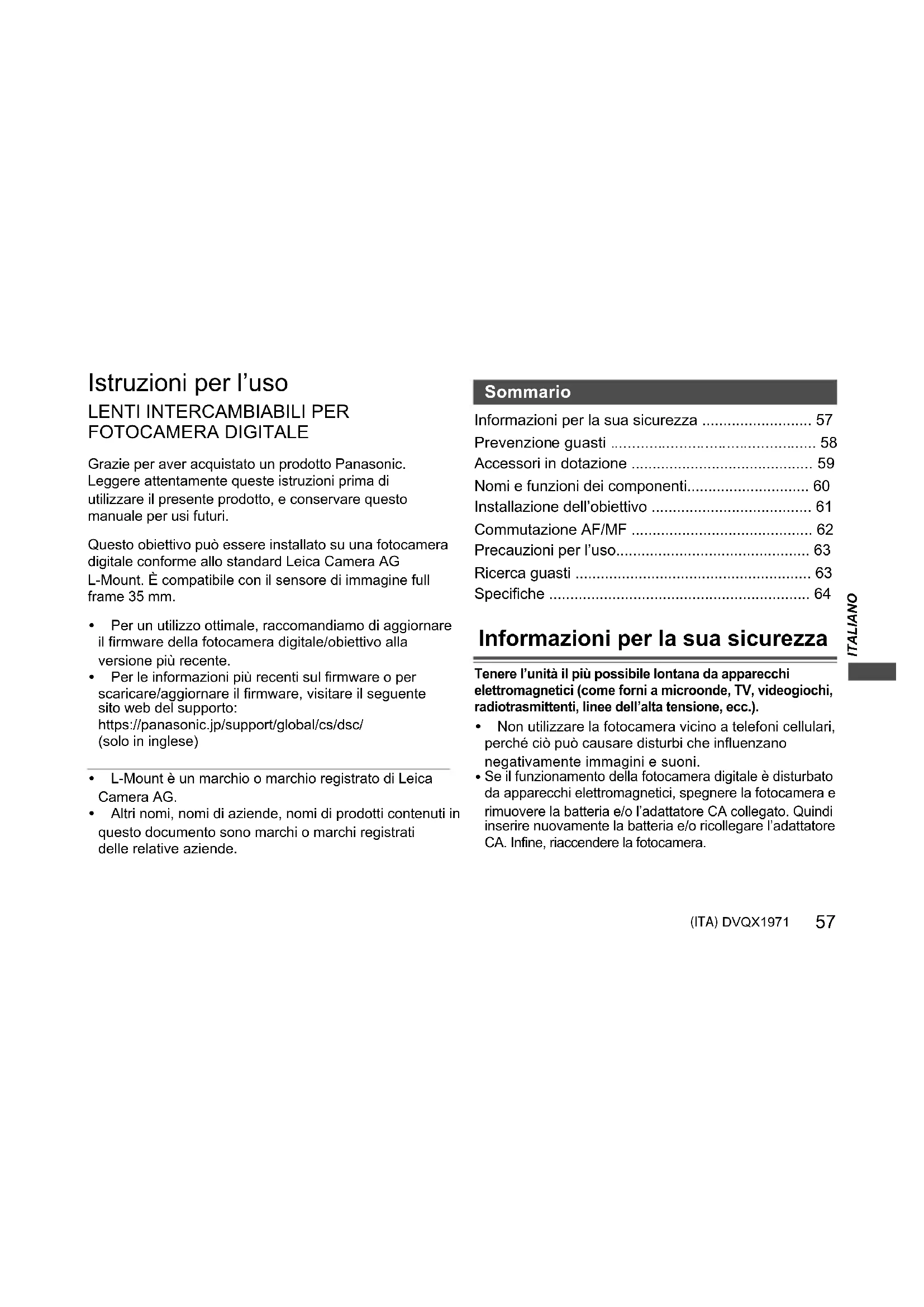 - FOTOCAMERA DIGITALE Grazie per aver acquistato un prodotto Panasonic.Leggere attentamente queste istruzioni prima di utilizzare il presente prodotto, e conservare questo manuale per usi futuri.Questo obiettivo può essere installato su una fotocamera digitale conforme allo standard Leica Camera AG L-Mount. È compatibile con il sensore di immagine full frame 35 mm. 0 Per un utilizzo ottimale, raccomandiamo di aggiornare il firmware della fotocamera digitale/obiettivo alla versione più recente. 0 Per le informazioni più recenti sul firmware o per scaricare/aggiornare il firmware, visitare il seguente sito web del supporto:https://panasonic.jp/support/global/cs/dsc/(solo in inglese) 0 L-Mount è un marchio o marchio registrato di Leica Camera AG. 0 Altri nomi, nomi di aziende, nomi di prodotti contenuti in questo documento sono marchi o marchi registrati delle relative aziende. Informazioni per la sua sicurezza p. 57