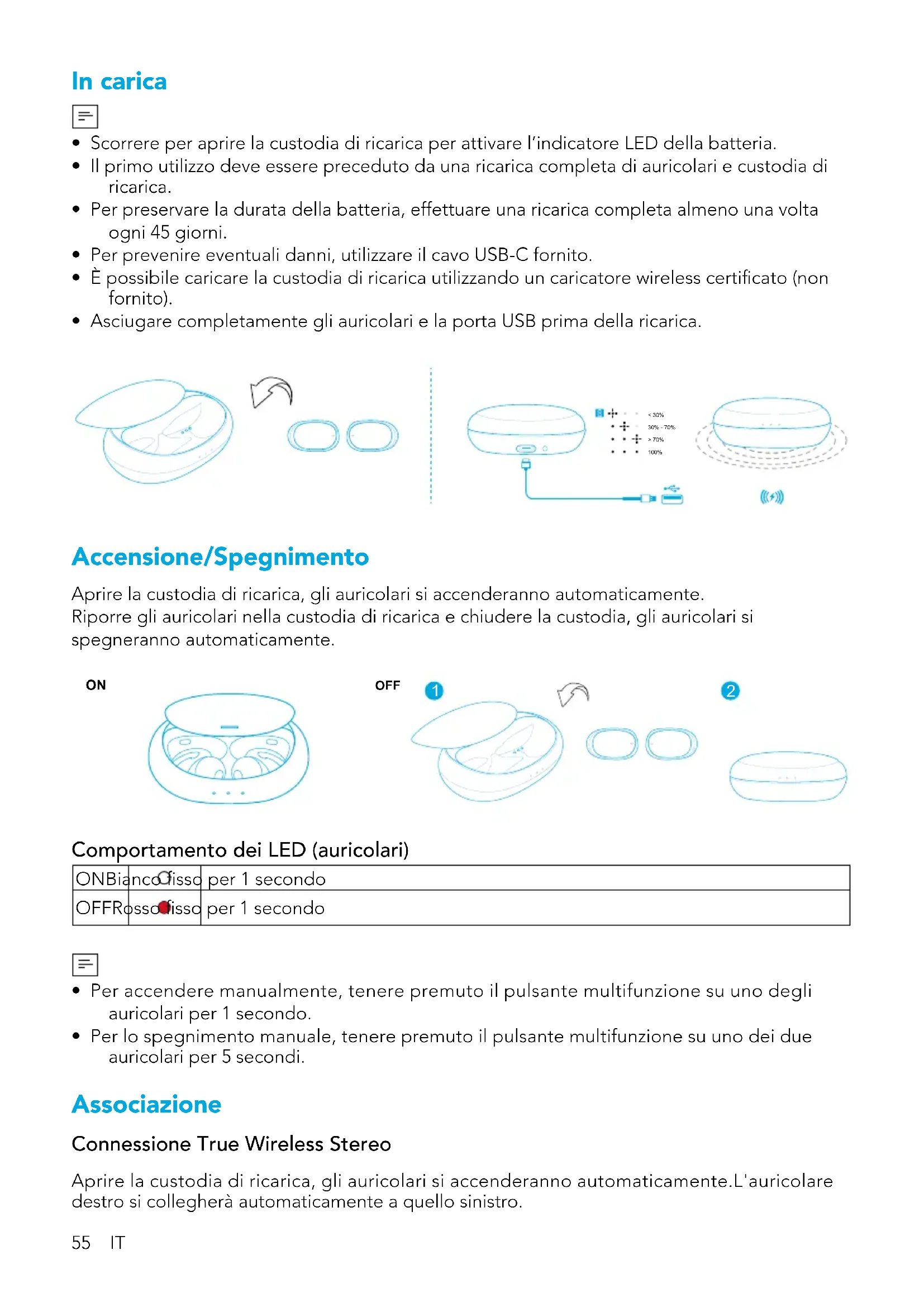 - Per lo spegnimento manuale, tenere premuto il pulsante multifunzione su uno dei due auricolari per 5 secondi. Associazione Connessione True Wireless Stereo Aprire la custodia di ricarica, gli auricolari si accenderanno automaticamente.L'auricolare destro si collegherà automaticamente a quello sinistro.IT 56 Comportamento dei LED (auricolari) Emissione luce bianca Connessione TWS in corso Bianco sso per 1 secondo Connessione TWS effettuata