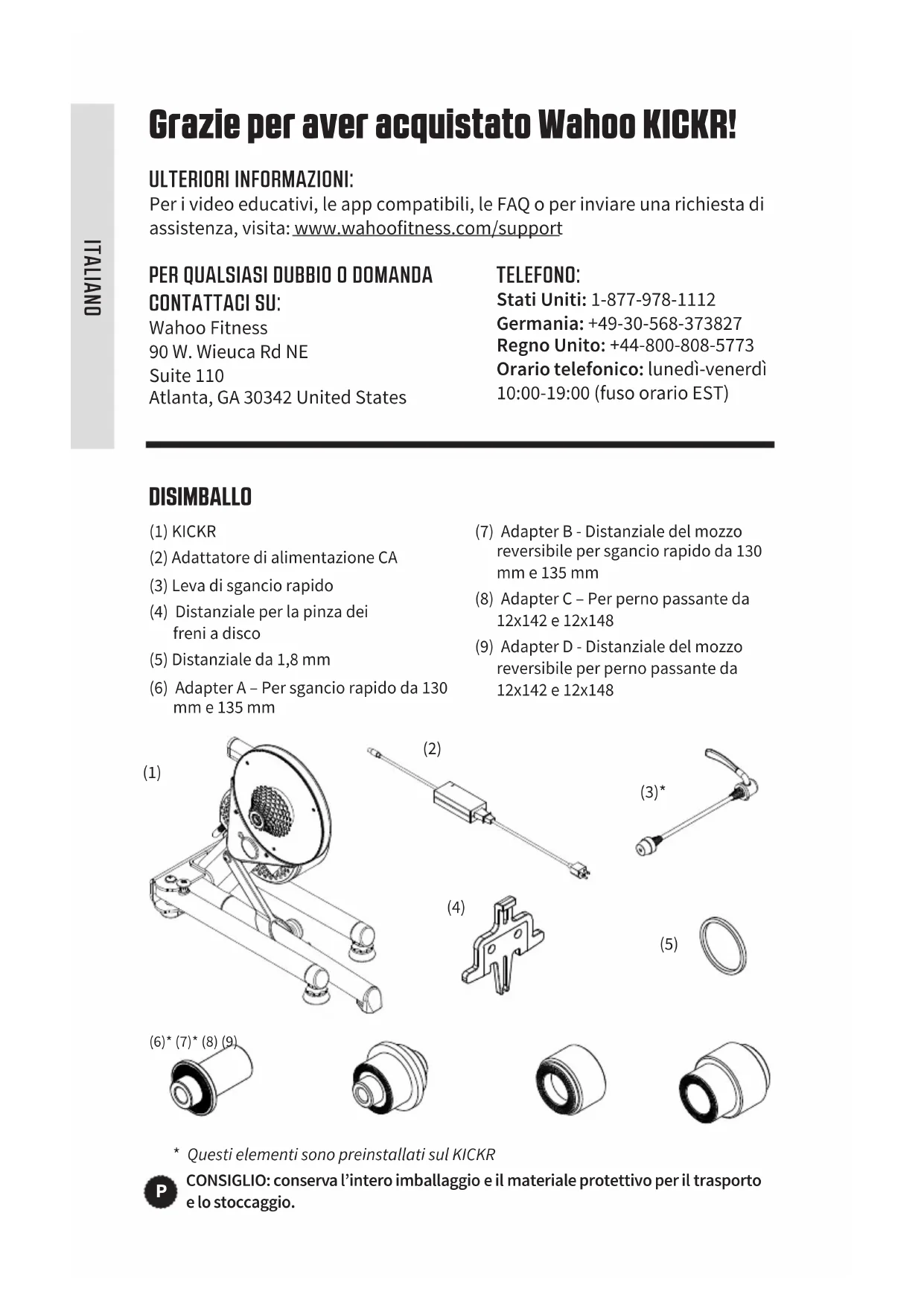 CONTATTACI SU: Wahoo Fitness 90 W. Wieuca Rd NE Suite 110 Atlanta, GA 30342 United States TELEFONO: Stati Uniti: 1-877-978-1112 Germania: +49-30-568-373827 Regno Unito: +44-800-808-5773 Orario telefonico: lunedì-venerdì 10:00-19:00 (fuso orario EST) DISIMBALLO (1) KICKR (2) Adattatore di alimentazione CA (3) Leva di sgancio rapido (4) Distanziale per la pinza dei freni a disco (5) Distanziale da 1,8 mm (6) Adapter A – Per sgancio rapido da 130 mm e 135 mm (7) Adapter B - Distanziale del mozzo reversibile per sgancio rapido da 130 mm e 135 mm (8) Adapter C – Per perno passante da 12x142 e 12x148 (9) Adapter D - Distanziale del mozzo reversibile per perno passante da 12x142 e 12x148 (6)* (7)* (8) (9) ITALIANO16