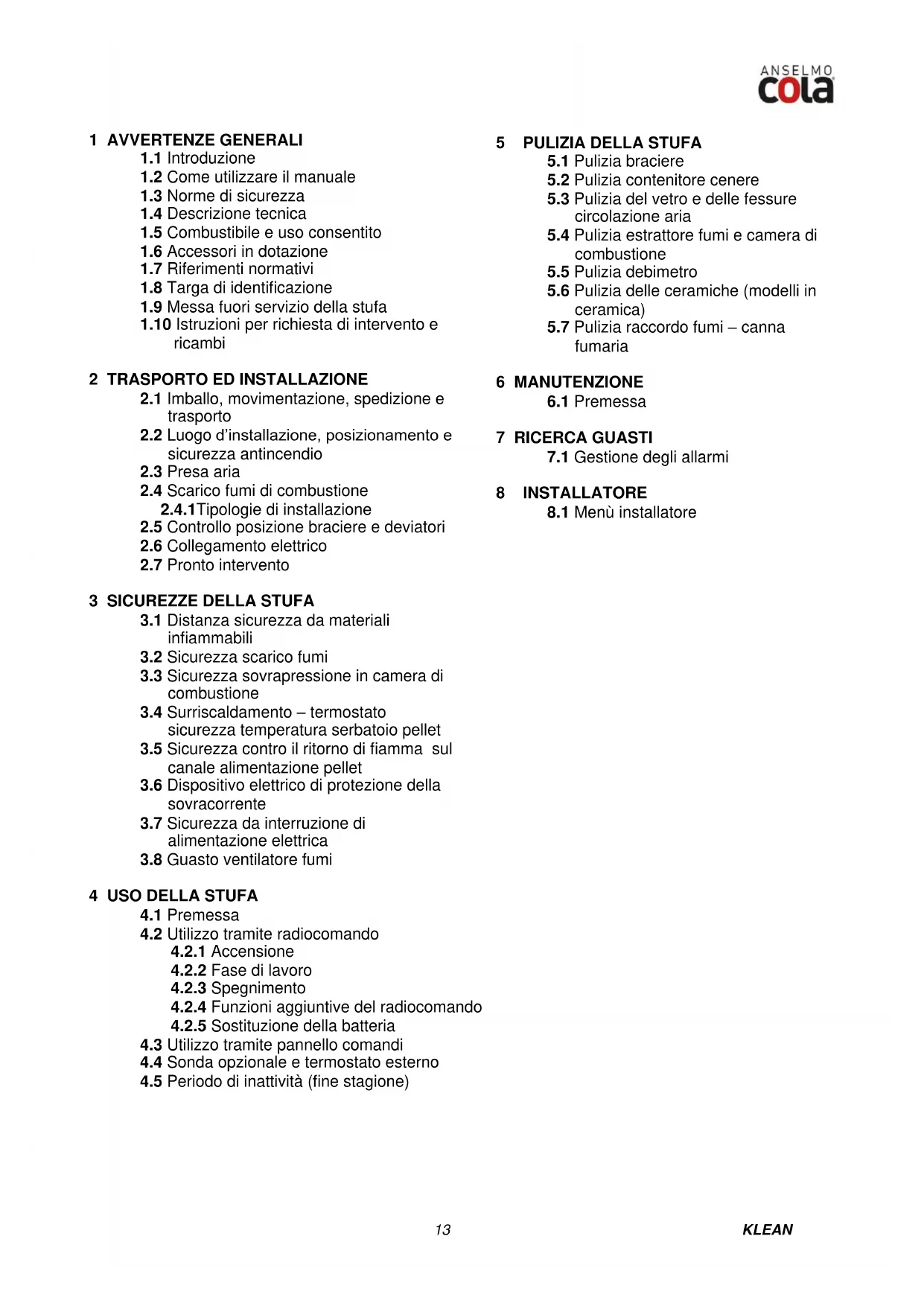 Per qualsiasi manutenzione e pulizia di fine stagione la ditta COLA consiglia di affidarsi ad un centro di assistenza autorizzato che, oltre ad eseguire le operazioni di pulizia verificherà anche lo stato di usura dei componenti interni alla stufa.