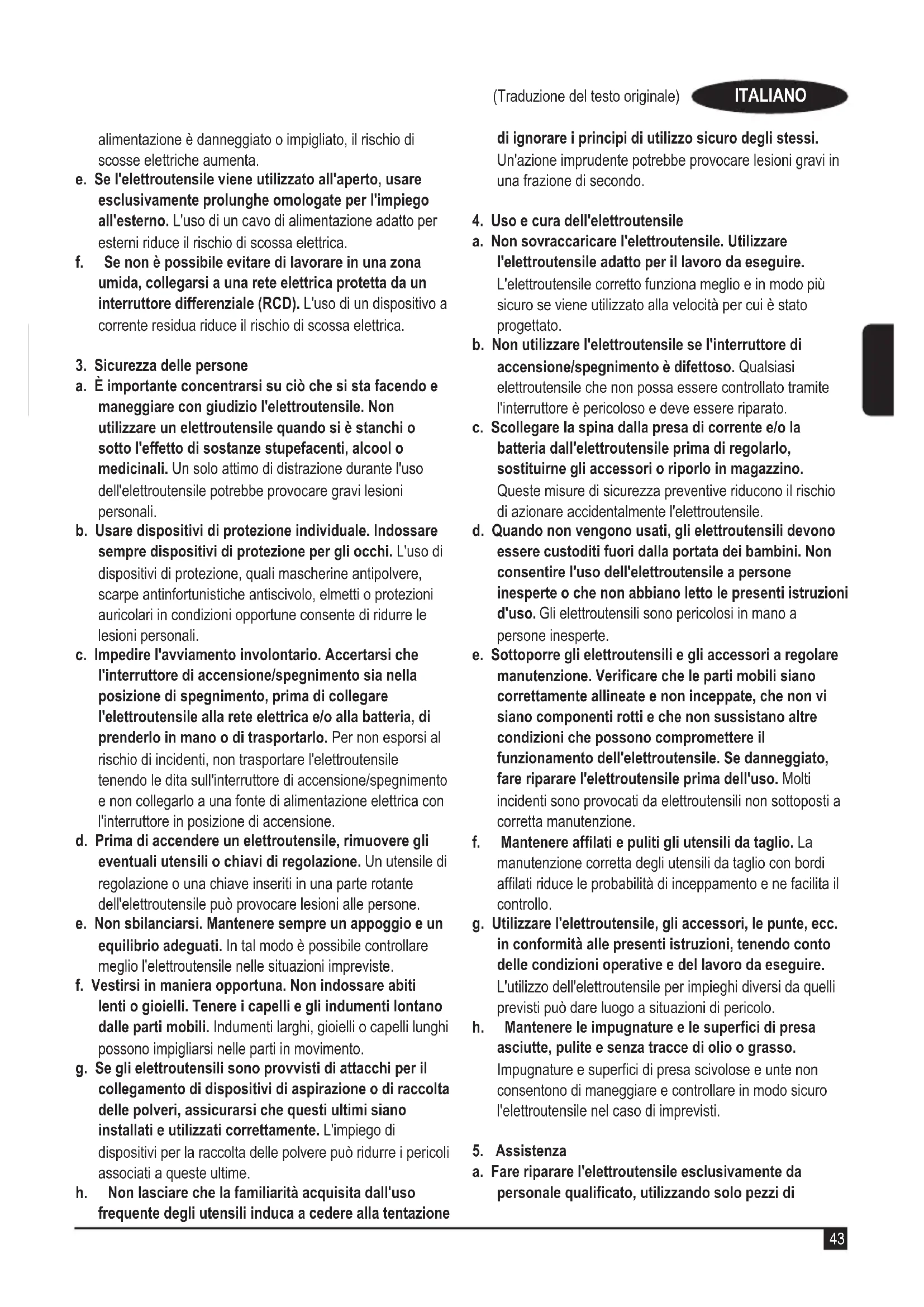 a. Le spine elettriche degli elettroutensili devono essere adatteallapresadicorrente.Nonmodicarelaspina in alcun modo. Non utilizzare spine con adattatore con gli elettroutensili dotati di messa a terra. Per ridurre il rischio di scosse elettriche evitare di modicare le spine e utilizzare sempre le prese di corrente appropriate. b. Evitareilcontattosicoconsupercicollegatea terra, come tubi, radiatori, forni e frigoriferi. Se il corpo dell'utilizzatore è collegato a terra, il rischio di scosse elettriche aumenta. c. Non esporre gli elettroutensili alla pioggia o all'umidità. Se penetra dell'acqua all'interno dell'elettroutensile, il rischio di scossa elettrica aumenta. d. Non utilizzare il cavo di alimentazione in modo improprio. Non utilizzare mai il cavo per spostare, tirare o scollegare l’elettroutensile. Tenere il cavo di alimentazione lontano da fonti di calore, olio, bordi taglienti o parti in movimento. Se il cavo di43 (Traduzione del testo originale) ITALIANO alimentazione è danneggiato o impigliato, il rischio di scosse elettriche aumenta. e. Se l'elettroutensile viene utilizzato all'aperto, usare esclusivamente prolunghe omologate per l'impiego all'esterno. L'uso di un cavo di alimentazione adatto per esterni riduce il rischio di scossa elettrica. f. Senonèpossibileevitaredilavorareinunazona umida, collegarsi a una rete elettrica protetta da un interruttore differenziale (RCD). L'uso di un dispositivo a corrente residua riduce il rischio di scossa elettrica.