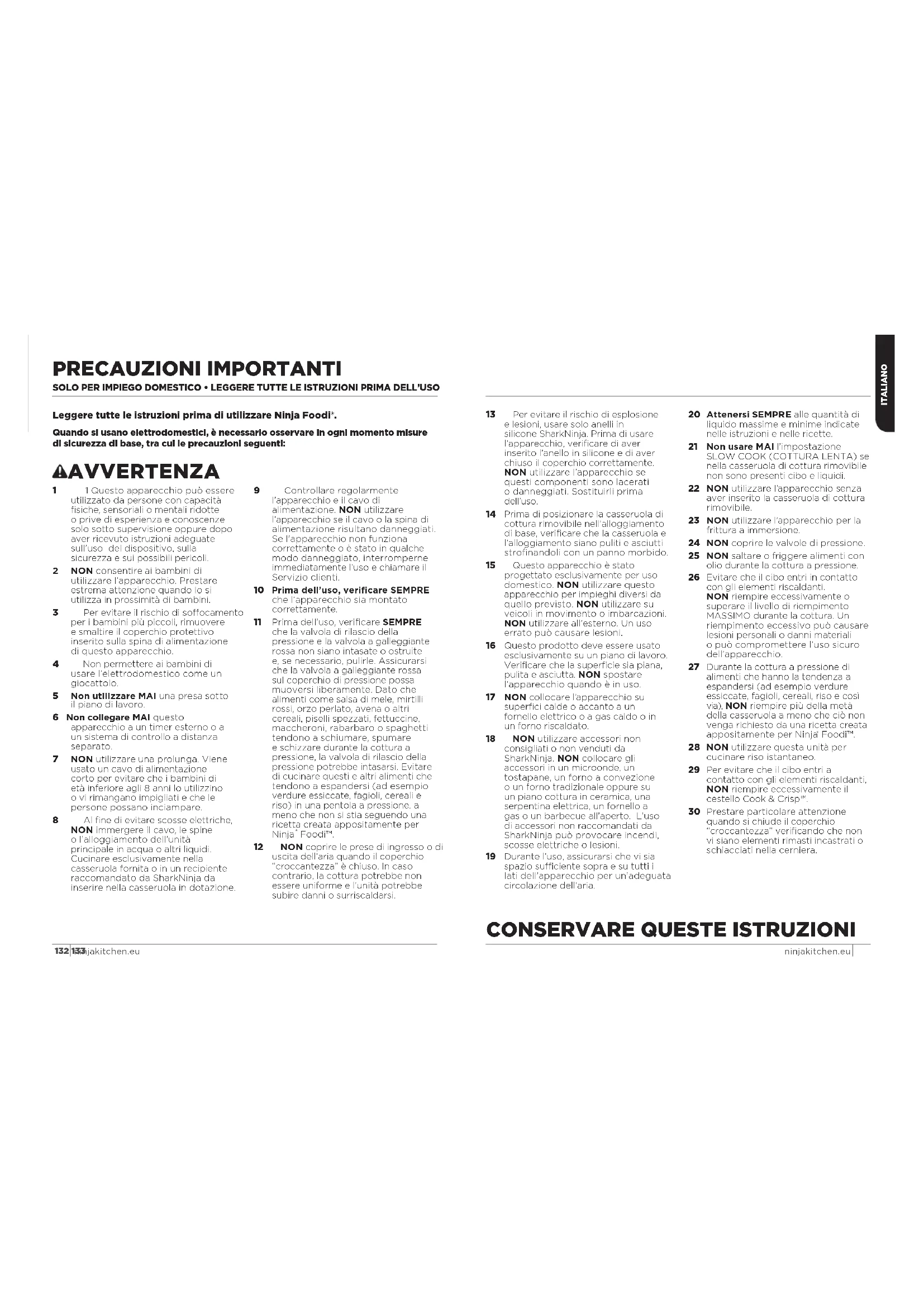 Foodi™. 12 NON coprire le prese di ingresso o di uscita dell’aria quando il coperchio “croccantezza” è chiuso. In caso contrario, la cottura potrebbe non essere uniforme e l’unità potrebbe subire danni o surriscaldarsi. 13 Per evitare il rischio di esplosione e lesioni, usare solo anelli in silicone SharkNinja. Prima di usare l’apparecchio, verificare di aver inserito l’anello in silicone e di aver chiuso il coperchio correttamente. NON utilizzare l’apparecchio se questi componenti sono lacerati o danneggiati. Sostituirli prima dell’uso. 14 Prima di posizionare la casseruola di cottura rimovibile nell’alloggiamento di base, verificare che la casseruola e l’alloggiamento siano puliti e asciutti strofinandoli con un panno morbido. 15 Questo apparecchio è stato progettato esclusivamente per uso domestico. NON utilizzare questo apparecchio per impieghi diversi da quello previsto. NON utilizzare su veicoli in movimento o imbarcazioni. NON utilizzare all’esterno. Un uso errato può causare lesioni. 16 Questo prodotto deve essere usato esclusivamente su un piano di lavoro. Verificare che la superficie sia piana, pulita e asciutta. NON spostare l’apparecchio quando è in uso. 17 NON collocare l’apparecchio su superfici calde o accanto a un fornello elettrico o a gas caldo o in un forno riscaldato. 18 NON utilizzare accessori non consigliati o non venduti da SharkNinja. NON collocare gli accessori in un microonde, un tostapane, un forno a convezione o un forno tradizionale oppure su un piano cottura in ceramica, una serpentina elettrica, un fornello a gas o un barbecue all’aperto. L’uso di accessori non raccomandati da SharkNinja può provocare incendi, scosse elettriche o lesioni. 19 Durante l’uso, assicurarsi che vi sia spazio sufficiente sopra e su tutti i lati dell’apparecchio per un’adeguata circolazione dell’aria. 20 Attenersi SEMPRE alle quantità di liquido massime e minime indicate nelle istruzioni e nelle ricette. 21 Non usare MAI l’impostazione SLOW COOK (COTTURA LENTA) se nella casseruola di cottura rimovibile non sono presenti cibo e liquidi. 22 NON utilizzare l’apparecchio senza aver inserito la casseruola di cottura rimovibile. 23 NON utilizzare l’apparecchio per la frittura a immersione. 24 NON coprire le valvole di pressione. 25 NON saltare o friggere alimenti con olio durante la cottura a pressione. 26 Evitare che il cibo entri in contatto con gli elementi riscaldanti. NON riempire eccessivamente o superare il livello di riempimento MASSIMO durante la cottura. Un riempimento eccessivo può causare lesioni personali o danni materiali o può compromettere l’uso sicuro dell’apparecchio. 27 Durante la cottura a pressione di alimenti che hanno la tendenza a espandersi (ad esempio verdure essiccate, fagioli, cereali, riso e così via), NON riempire più della metà della casseruola a meno che ciò non venga richiesto da una ricetta creata appositamente per Ninja