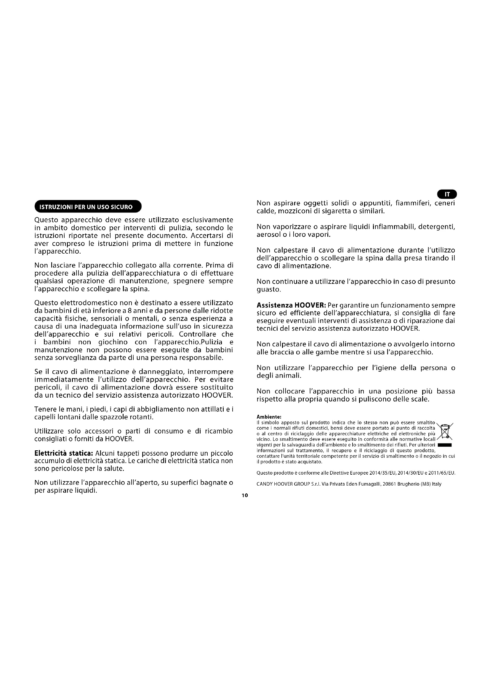 Questo apparecchio deve essere utilizzato esclusivamente in ambito domestico per interventi di pulizia, secondo le istruzioni riportate nel presente documento. Accertarsi di aver compreso le istruzioni prima di mettere in funzione l’apparecchio. Non lasciare l’apparecchio collegato alla corrente. Prima di procedere alla pulizia dell’apparecchiatura o di effettuare qualsiasi operazione di manutenzione, spegnere sempre l’apparecchio e scollegare la spina. Questo elettrodomestico non è destinato a essere utilizzato da bambini di età inferiore a 8 anni e da persone dalle ridotte capacità fisiche, sensoriali o mentali, o senza esperienza a causa di una inadeguata informazione sull’uso in sicurezza dell’apparecchio e sui relativi pericoli. Controllare che i bambini non giochino con l’apparecchio.Pulizia e manutenzione non possono essere eseguite da bambini senza sorveglianza da parte di una persona responsabile. Se il cavo di alimentazione è danneggiato, interrompere immediatamente l’utilizzo dell’apparecchio. Per evitare pericoli, il cavo di alimentazione dovrà essere sostituito da un tecnico del servizio assistenza autorizzato HOOVER. Tenere le mani, i piedi, i capi di abbigliamento non attillati e i capelli lontani dalle spazzole rotanti. Utilizzare solo accessori o parti di consumo e di ricambio consigliati o forniti da HOOVER. Elettricità statica: Alcuni tappeti possono produrre un piccolo accumulo di elettricità statica. Le cariche di elettricità statica non sono pericolose per la salute. Non utilizzare l’apparecchio all’aperto, su superfici bagnate o per aspirare liquidi. Non aspirare oggetti solidi o appuntiti, fiammiferi, ceneri calde, mozziconi di sigaretta o similari. Non vaporizzare o aspirare liquidi infiammabili, detergenti, aerosol o i loro vapori. Non calpestare il cavo di alimentazione durante l’utilizzo dell’apparecchio o scollegare la spina dalla presa tirando il cavo di alimentazione. Non continuare a utilizzare l’apparecchio in caso di presunto guasto. Assistenza HOOVER: Per garantire un funzionamento sempre sicuro ed efficiente dell’apparecchiatura, si consiglia di fare eseguire eventuali interventi di assistenza o di riparazione dai tecnici del servizio assistenza autorizzato HOOVER. Non calpestare il cavo di alimentazione o avvolgerlo intorno alle braccia o alle gambe mentre si usa l’apparecchio. Non utilizzare l’apparecchio per l’igiene della persona o degli animali. Non collocare l’apparecchio in una posizione più bassa rispetto alla propria quando si puliscono delle scale. Ambiente: Il simbolo apposto sul prodotto indica che lo stesso non può essere smaltito come i normali rifiuti domestici, bensì deve essere portato al punto di raccolta o al centro di riciclaggio delle apparecchiature elettriche ed elettroniche più vicino. Lo smaltimento deve essere eseguito in conformità alle normative locali vigenti per la salvaguardia dell’ambiente e lo smaltimento dei rifiuti. Per ulteriori informazioni sul trattamento, il recupero e il riciclaggio di questo prodotto, contattare l’unità territoriale competente per il servizio di smaltimento o il negozio in cui il prodotto è stato acquistato. Questo prodotto è conforme alle Direttive Europee 2014/35/EU, 2014/30/EU e 2011/65/EU. CANDY HOOVER GROUP S.r.l. Via Privata Eden Fumagalli, 20861 Brugherio (MB) Italy
