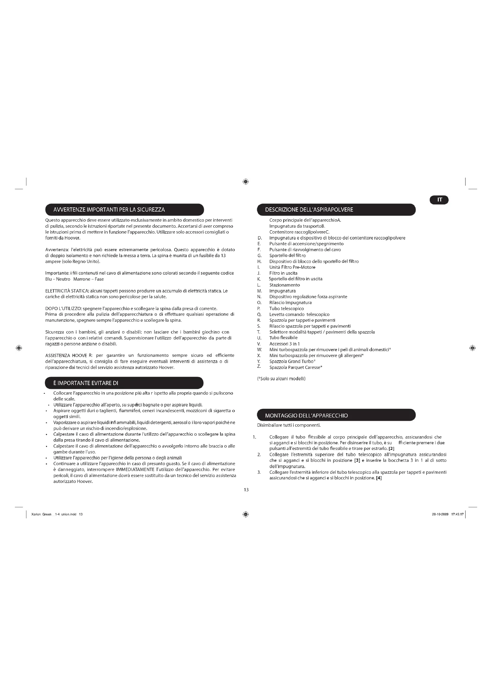 Questo apparecchio deve essere utilizzato esclusivamente in ambito domestico per interventi di pulizia, secondo le istruzioni riportate nel presente documento. Accertarsi di aver compreso le istruzioni prima di mettere in funzione l’apparecchio. Utilizzare solo accessori consigliati o forniti da Hoover. Avvertenza: l’elettricità può essere estremamente pericolosa. Questo apparecc hio è dotato di doppio isolamento e non richiede la messa a terra. La spina è munita di un fusibile da 13 ampere (solo Regno Unito). Blu – Neutro Marrone – Fase ELETTRICITÀ STATICA: alcuni tappeti possono produrre un accumulo di elettricità statica. Le cariche di elettricità statica non sono pericolose per la salute. DOPO L’UTILIZZO: spegnere l’apparecchio e scollegare la spina dalla presa di corrente. manutenzione, spegnere sempre l’apparecchio e scollegare la spina. Sicurezza con i bambini, gli anziani o disabili: non lasciare che i bambini giochino con l’apparecchio o con i relativi comandi. Supervisionare l’utilizzo dell’apparecchio da parte di ragazzi o persone anziane o disabili. ASSISTENZA HOOVE dell’apparecchiatura, si consiglia di fare eseguire eventuali interventi di assistenza o di riparazione dai tecnici del servizio assistenza autorizzato Hoover.