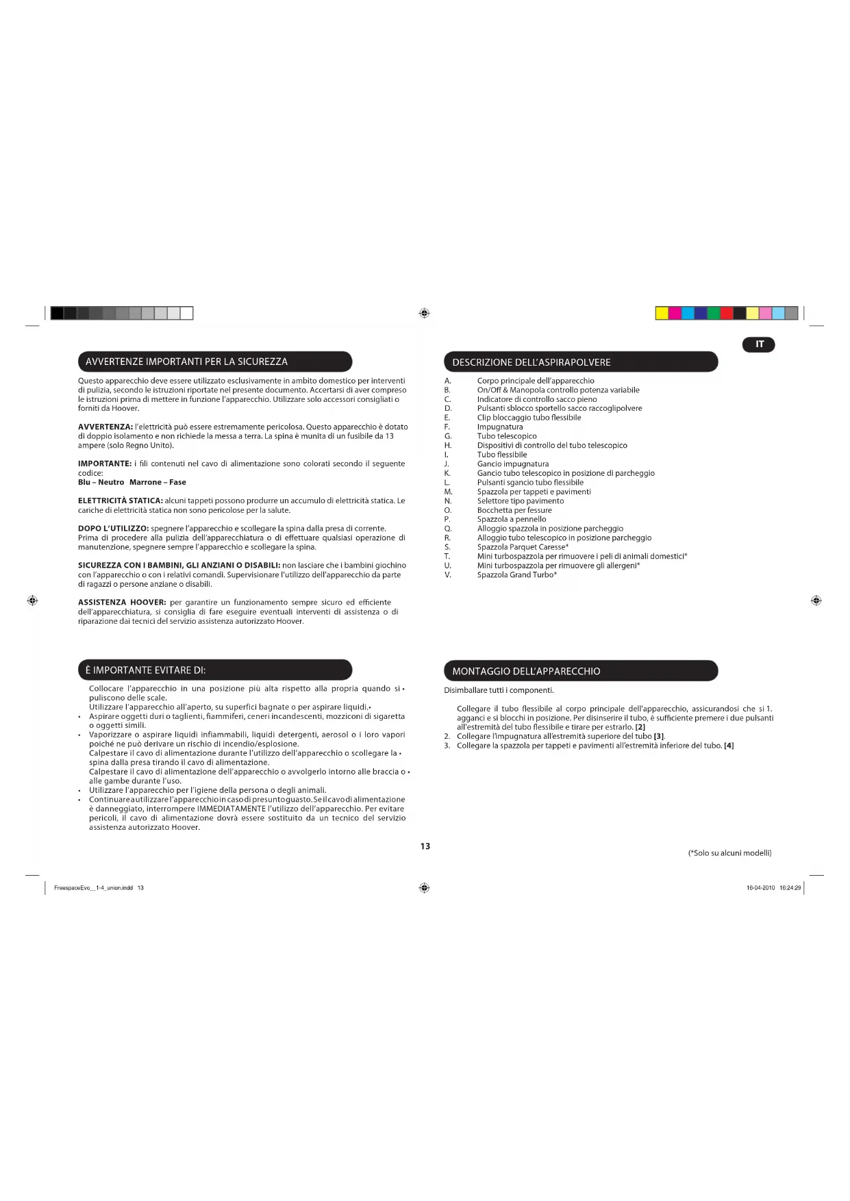 Questo apparecchio deve essere utilizzato esclusivamente in ambito domestico per interventi di pulizia, secondo le istruzioni riportate nel presente documento. Accertarsi di aver compreso le istruzioni prima di mettere in funzione l’apparecchio. Utilizzare solo accessori consigliati o forniti da Hoover. AVVERTENZA: l’elettricità può essere estremamente pericolosa. Questo apparecchio è dotato di doppio isolamento e non richiede la messa a terra. La spina è munita di un fusibile da 13 ampere (solo Regno Unito). IMPORTANTE: i li contenuti nel cavo di alimentazione sono colorati secondo il seguente codice: Blu – Neutro Marrone – Fase ELETTRICITÀ STATICA: alcuni tappeti possono produrre un accumulo di elettricità statica. Le cariche di elettricità statica non sono pericolose per la salute. DOPO L’UTILIZZO: spegnere l’apparecchio e scollegare la spina dalla presa di corrente. Prima di procedere alla pulizia dell’apparecchiatura o di eettuare qualsiasi operazione di manutenzione, spegnere sempre l’apparecchio e scollegare la spina. SICUREZZA CON I BAMBINI, GLI ANZIANI O DISABILI: non lasciare che i bambini giochino con l’apparecchio o con i relativi comandi. Supervisionare l’utilizzo dell’apparecchio da parte di ragazzi o persone anziane o disabili. ASSISTENZA HOOVER: per garantire un funzionamento sempre sicuro ed eciente dell’apparecchiatura, si consiglia di fare eseguire eventuali interventi di assistenza o di riparazione dai tecnici del servizio assistenza autorizzato Hoover. (*Solo su alcuni modelli)