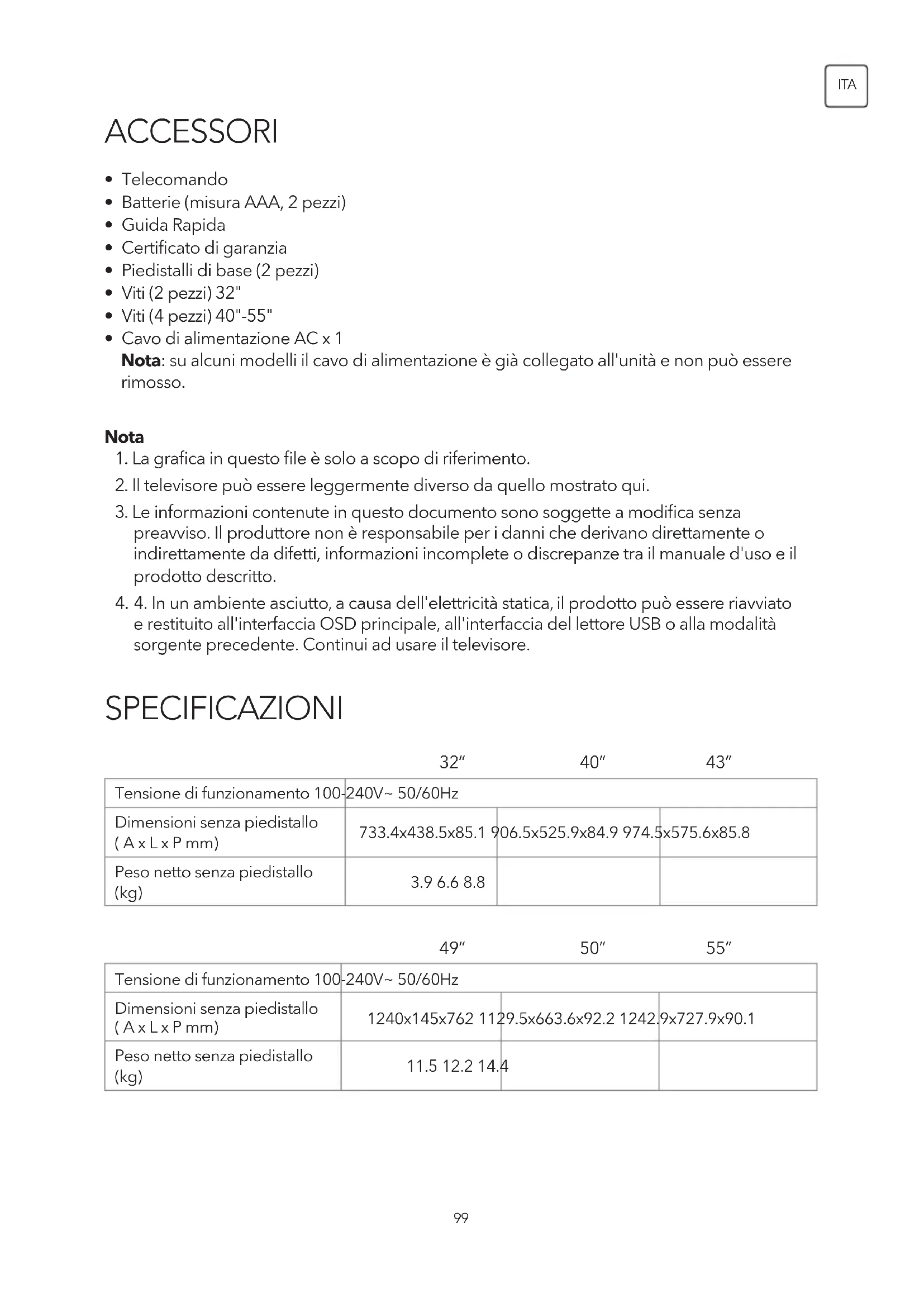 e restituito all'interfaccia OSD principale, all'interfaccia del lettore USB o alla modalità sorgente precedente. Continui ad usare il televisore. 32” 49” 40” 50” Tensione di funzionamento 100-240V~ 50/60Hz Dimensioni senza piedistallo ( A x L x P mm) 733.4x438.5x85.1 906.5x525.9x84.9 974.5x575.6x85.8 Peso netto senza piedistallo (kg)