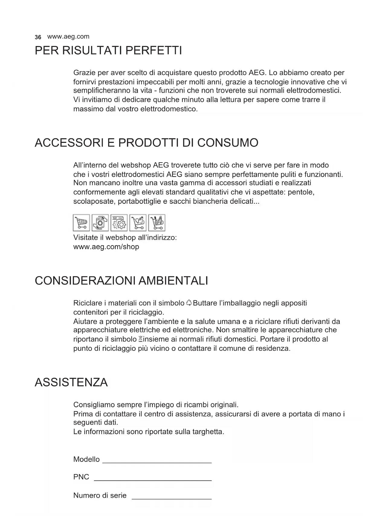 All’interno del webshop AEG troverete tutto ciò che vi serve per fare in modo che i vostri elettrodomestici AEG siano sempre perfettamente puliti e funzionanti. Non mancano inoltre una vasta gamma di accessori studiati e realizzati conformemente agli elevati standard qualitativi che vi aspettate: pentole, scolaposate, portabottiglie e sacchi biancheria delicati... Visitate il webshop all’indirizzo: www.aeg.com/shop CONSIDERAZIONI AMBIENTALI Riciclare i materiali con il simbolo . Buttare l’imballaggio negli appositi contenitori per il riciclaggio.