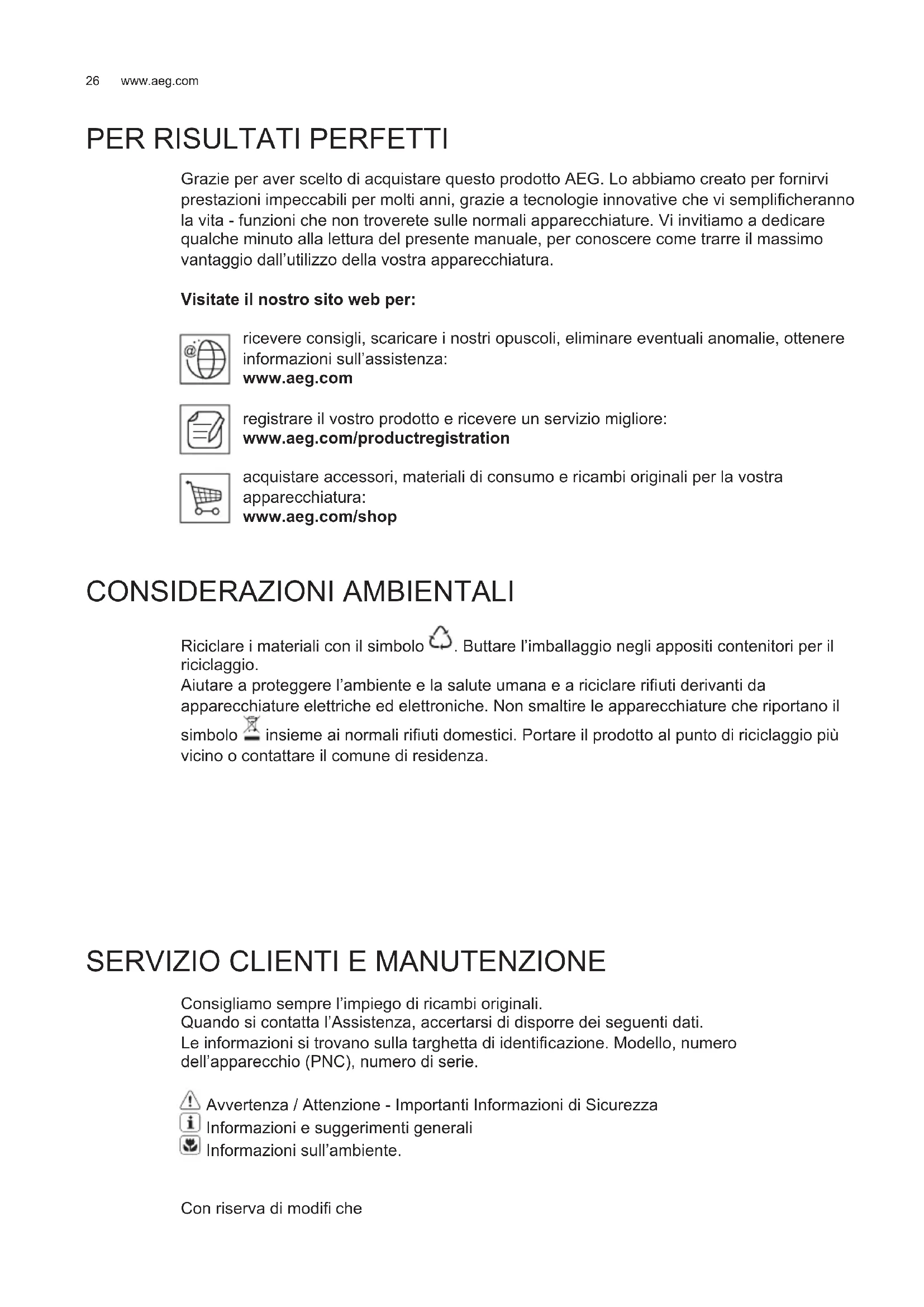 Consigliamo sempre l’impiego di ricambi originali. Quando si contatta l’Assistenza, accertarsi di disporre dei seguenti dati. Le informazioni si trovano sulla targhetta di identifi cazione. Modello, numero dell’apparecchio (PNC), numero di serie. Avvertenza / Attenzione - Importanti Informazioni di Sicurezza Informazioni e suggerimenti generali Informazioni sull’ambiente. Con riserva di modifi che