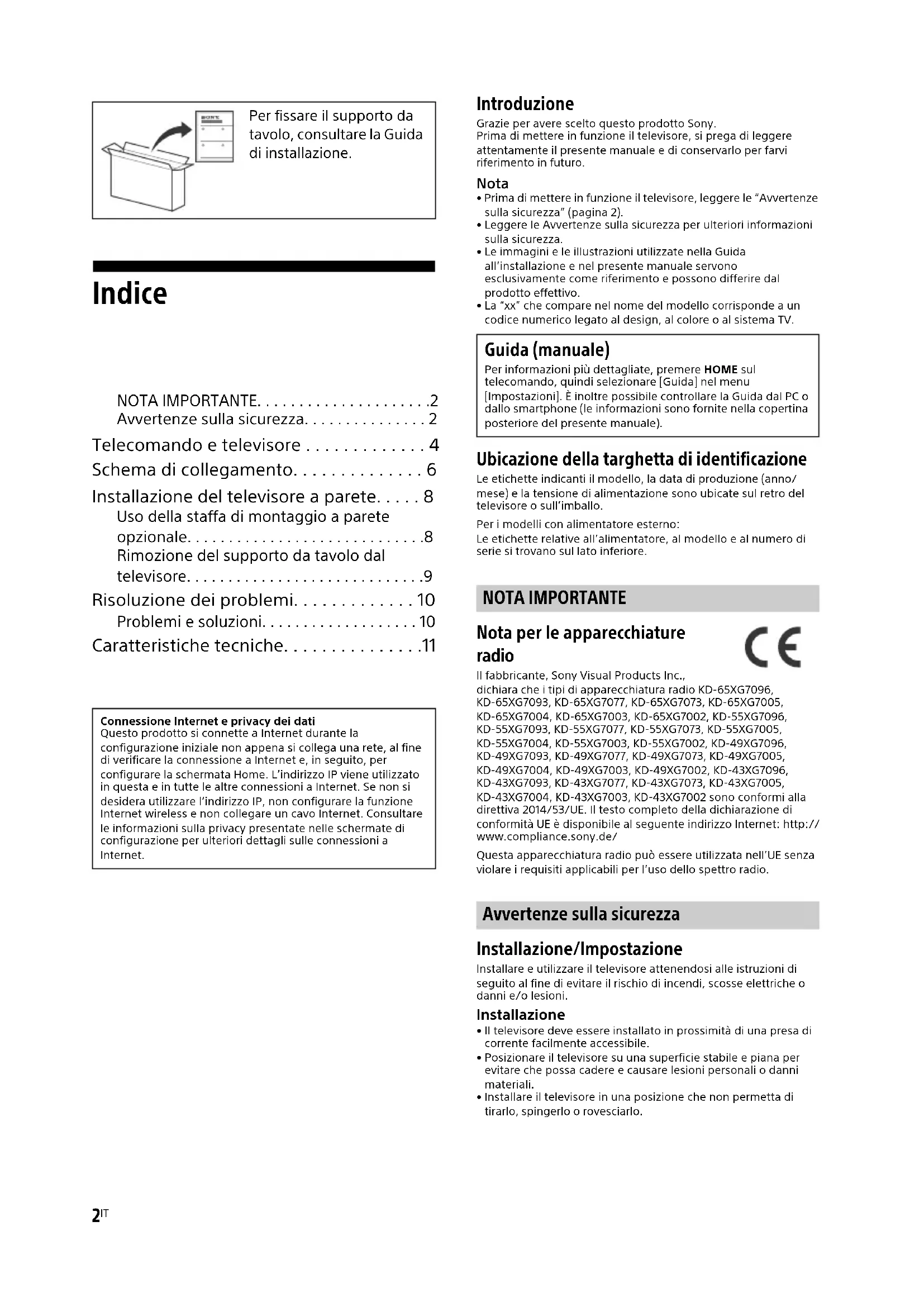 - Prima di mettere in funzione il televisore, leggere le “Avvertenze sulla sicurezza” (pagina 2).• Leggere le Avvertenze sulla sicurezza per ulteriori informazioni sulla sicurezza.• Le immagini e le illustrazioni utilizzate nella Guida all’installazione e nel presente manuale servono esclusivamente come riferimento e possono differire dal prodotto effettivo.• La “xx” che compare nel nome del modello corrisponde a un codice numerico legato al design, al colore o al sistema TV. Ubicazione della targhetta di identificazione Le etichette indicanti il modello, la data di produzione (anno/mese) e la tensione di alimentazione sono ubicate sul retro del televisore o sull’imballo.Per i modelli con alimentatore esterno:Le etichette relative all’alimentatore, al modello e al numero di serie si trovano sul lato inferiore. NOTA IMPORTANTE Nota per le apparecchiature radio Il fabbricante, Sony Visual Products Inc., dichiara che i tipi di apparecchiatura radio KD-65XG7096, KD-65XG7093, KD-65XG7077, KD-65XG7073, KD-65XG7005, KD-65XG7004, KD-65XG7003, KD-65XG7002, KD-55XG7096, KD-55XG7093, KD-55XG7077, KD-55XG7073, KD-55XG7005, KD-55XG7004, KD-55XG7003, KD-55XG7002, KD-49XG7096, KD-49XG7093, KD-49XG7077, KD-49XG7073, KD-49XG7005, KD-49XG7004, KD-49XG7003, KD-49XG7002, KD-43XG7096, KD-43XG7093, KD-43XG7077, KD-43XG7073, KD-43XG7005, KD-43XG7004, KD-43XG7003, KD-43XG7002 sono conformi alla direttiva 2014/53/UE. Il testo completo della dichiarazione di conformità UE è disponibile al seguente indirizzo Internet: http://www.compliance.sony.de/Questa apparecchiatura radio può essere utilizzata nell’UE senza violare i requisiti applicabili per l’uso dello spettro radio. Avvertenze sulla sicurezza Installazione/Impostazione Installare e utilizzare il televisore attenendosi alle istruzioni di seguito al fine di evitare il rischio di incendi, scosse elettriche o danni e/o lesioni. Installazione